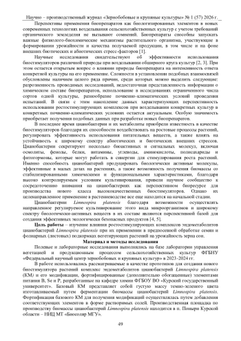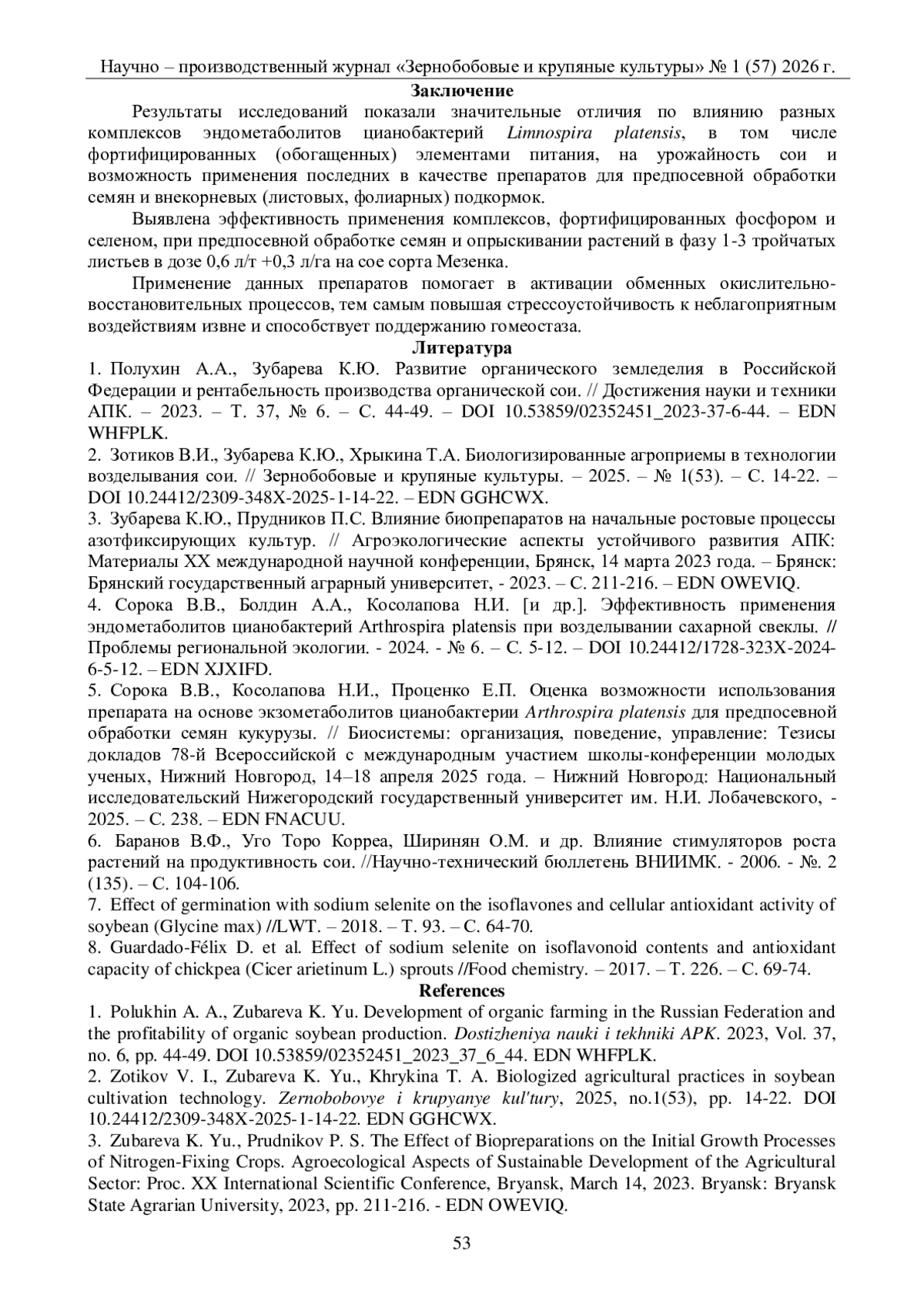 2. Зотиков В.И., Зубарева К.Ю., Хрыкина Т.А. Биологизированные агроприемы в технологии возделывания сои. // Зернобобовые и крупяные культуры. - 2025. - № 1(53). - С. 14-22. DOI: 10.24412/2309-348X-2025-1-14-22