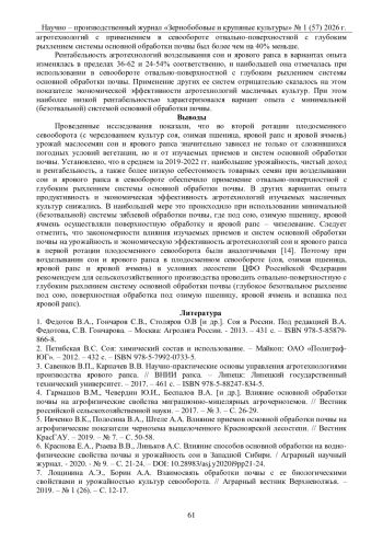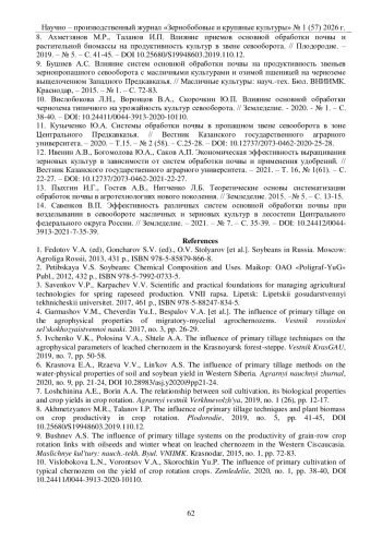 4. Гармашов В.М., Чевердин Ю.И., Беспалов В.А. [и др.]. Влияние основной обработки почвы на агрофизические свойства миграционно-мицелярных агрочерноземов. // Вестник российской сельскохозяйственной науки. - 2017. - № 3. - С. 26-29.