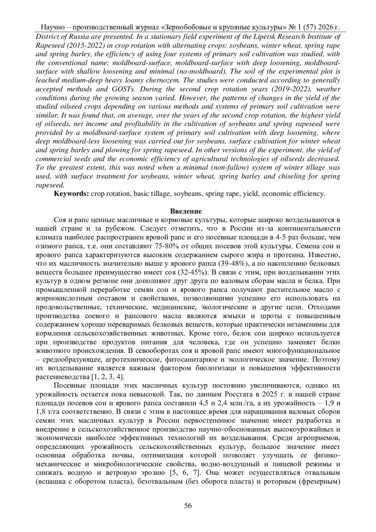 Соя и рапс ценные масличные и кормовые культуры, которые широко возделываются в нашей стране и за рубежом. Следует отметить, что в России из-за континентальности климата наиболее распространен яровой рапс и его посевные площади в 4-5 раз больше, чем озимого рапса, т. е. они составляют 75-80% от общих посевов этой культуры. Семена сои и ярового рапса характеризуются высоким содержанием сырого жира и протеина. Известно, что их масличность значительно выше у ярового рапса (39-48%), а по накоплению белковых веществ большее преимущество имеет соя (32-45%). В связи с этим, при возделывании этих культур в одном регионе они дополняют друг друга по валовым сборам масла и белка. При промышленной переработке семян сои и ярового рапса получают растительное масло с жирнокислотным составом и свойствами, позволяющими успешно его использовать на продовольственные, технические, медицинские, экологические и другие цели. Отходами производства соевого и рапсового масла являются жмыхи и шроты с повышенным содержанием хорошо переваримых белковых веществ, которые практически незаменимы для кормления сельскохозяйственных животных. Кроме того, белок сои широко используется при производстве продуктов питания для человека, где он успешно заменяет белки животного происхождения. В севооборотах соя и яровой рапс имеют многофункциональное – средообразующее, агротехническое, фитосанитарное и экологическое значение. Поэтому их возделывание является важным фактором биологизаци и повышения эффективности растениеводства [1, 2, 3, 4]