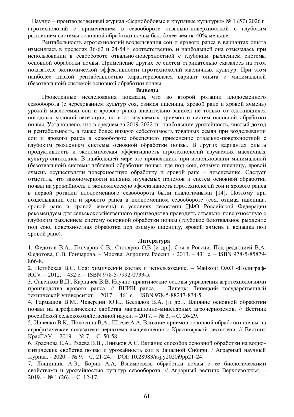 6. Краснова Е.А., Рзаева В.В., Линьков А.С. Влияние способов основной обработки на водно-физические свойства почвы и урожайность сои в Западной Сибири. / Аграрный научный журнал. - 2020. - № 9. - С. 21-24. -. DOI: 10.28983/asj.y2020i9pp21-24