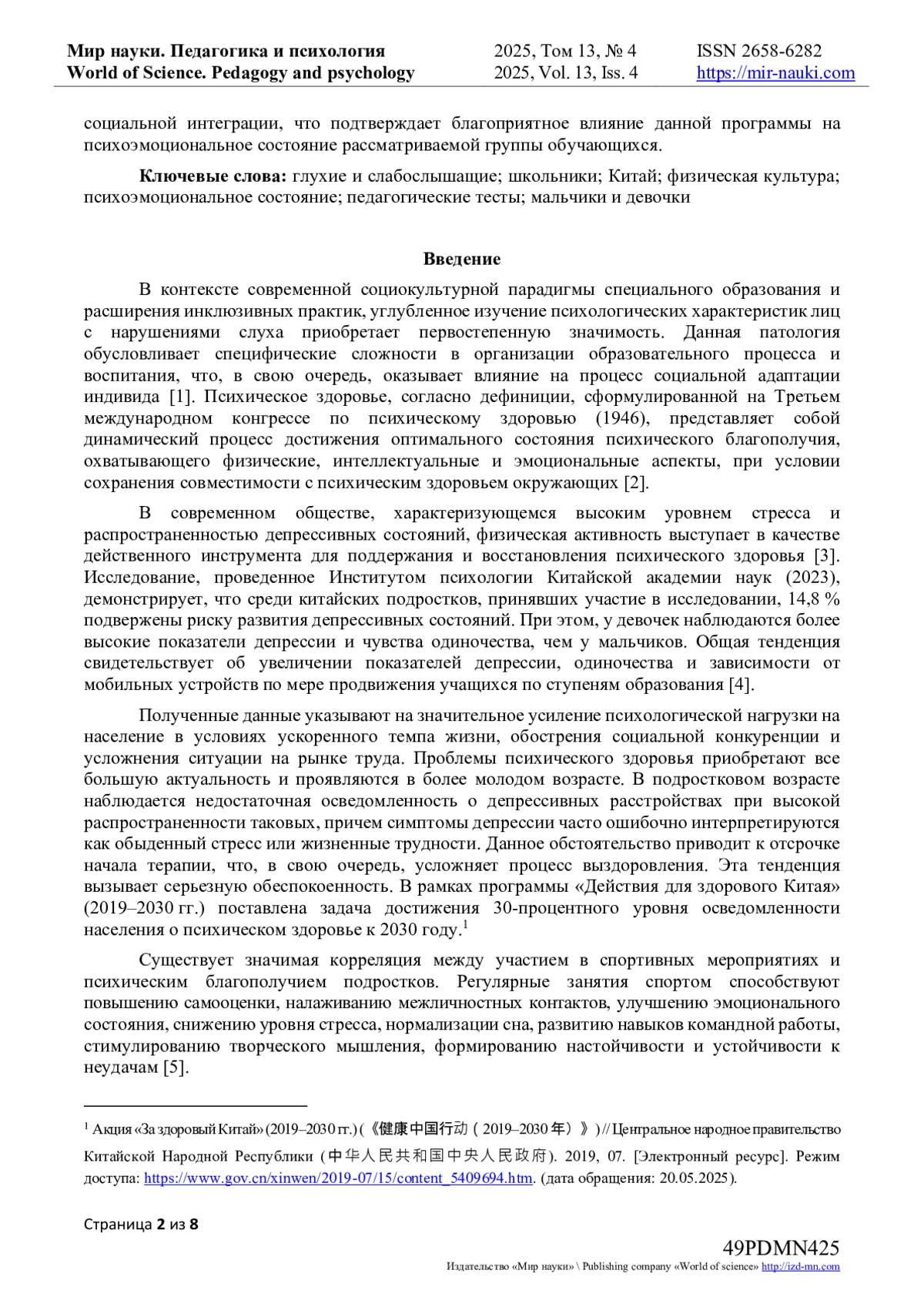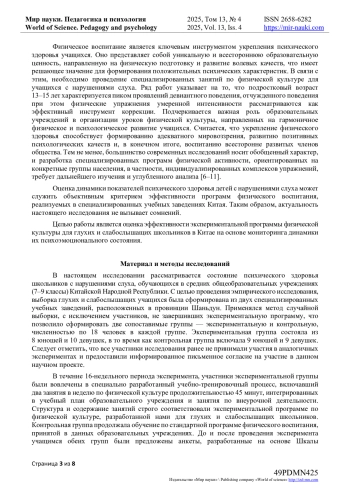 Материалы и методы. В настоящем исследовании анализируются аспекты психологического благополучия глухих и слабослышащих учащихся подросткового возраста средней школы в Китае. Объектом исследования стали ученики с нарушениями слуха, обучающиеся в двух специализированных школах провинции Шаньдун. Участники экспериментальной группы были вовлечены в специально разработанный учебно-тренировочный процесс по физической культуре, интегрированных в учебный план образовательного учреждения и занятия по внеурочной деятельности. Для оценки динамики психического состояния участников до и после экспериментальной деятельности применялась «Китайская шкала психического здоровья для учащихся средней школы».