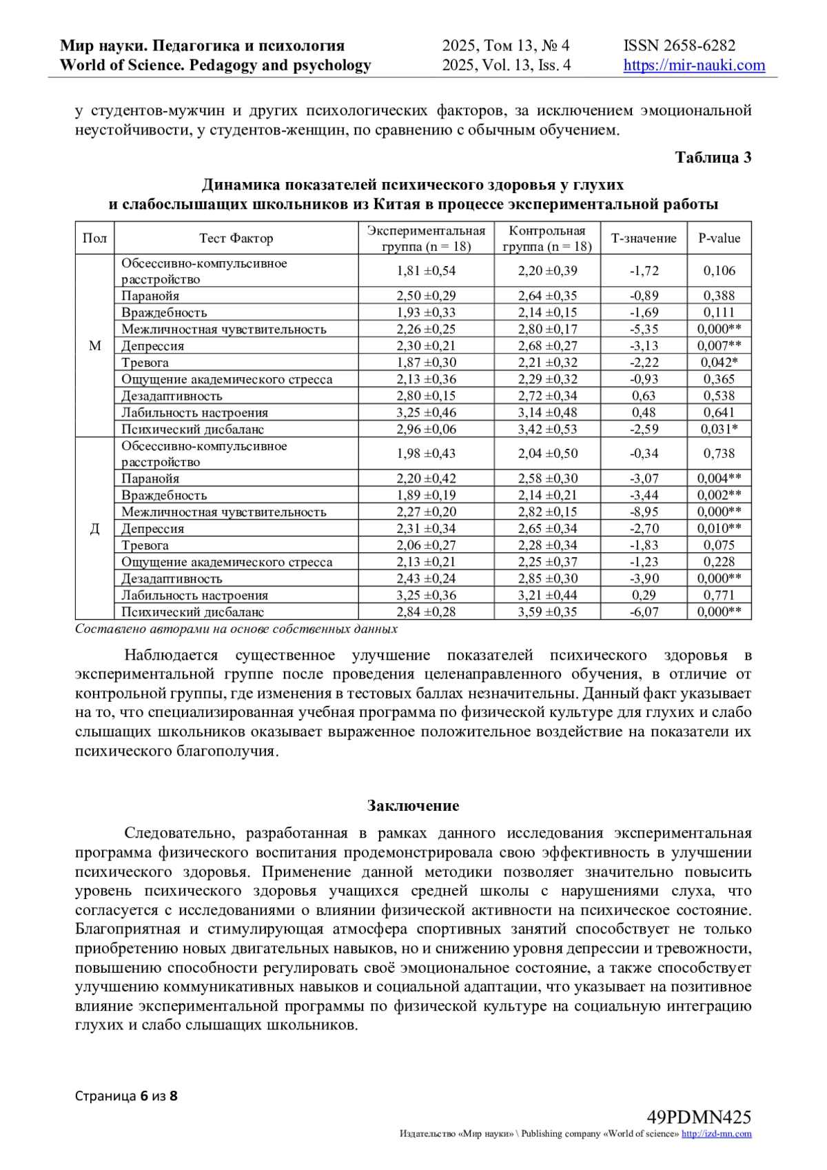 Заключение. Полученные данные позволяют утверждать, что специализированные занятия физической культурой демонстрируют эффективность в снижении симптомов депрессивных и тревожных расстройств у подростков с нарушениями слуха, а также способствуют оптимизации их коммуникативных способностей и социальной интеграции, что подтверждает благоприятное влияние данной программы на психоэмоциональное состояние рассматриваемой группы обучающихся.