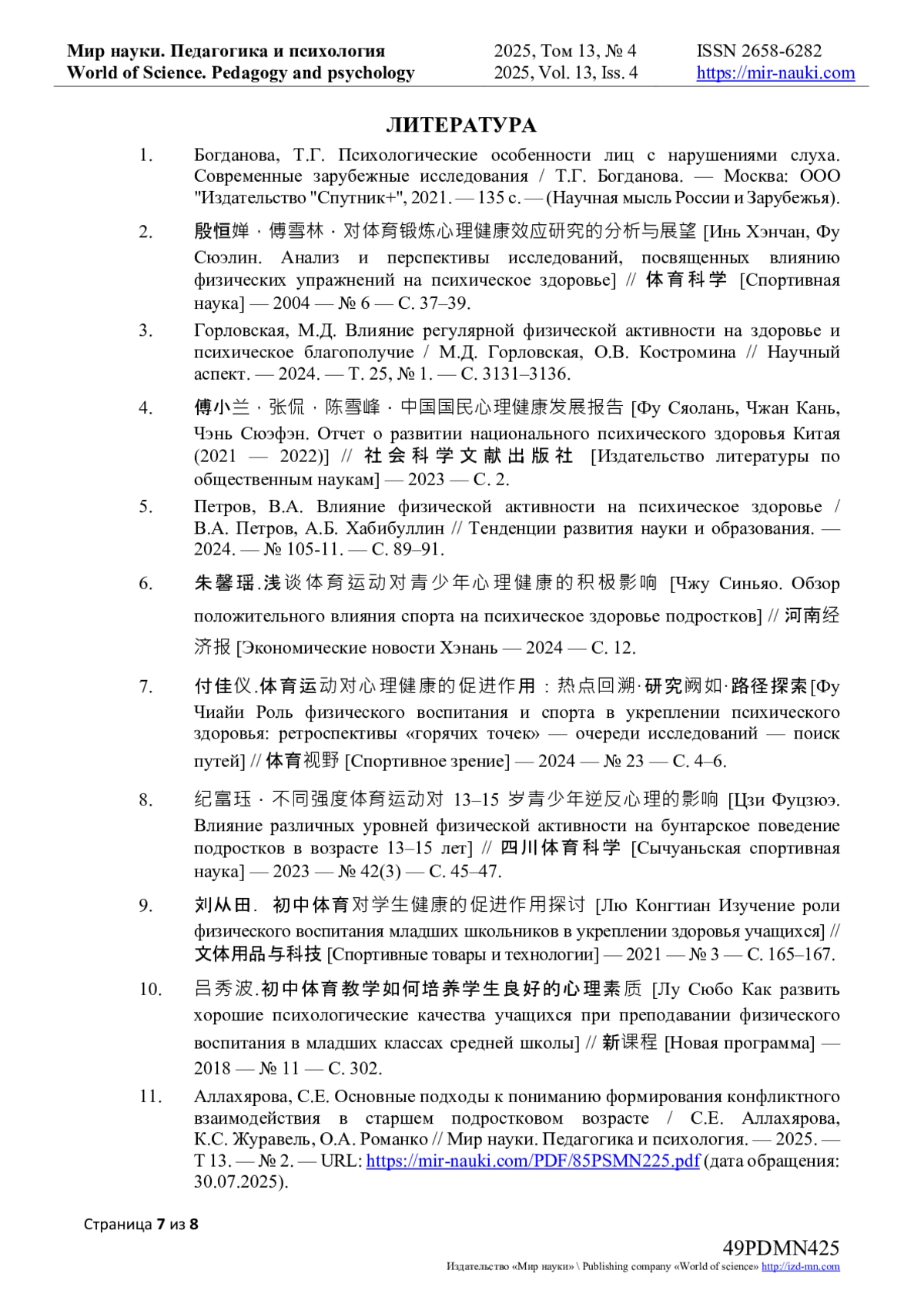 8. 纪富珏 不同强度体育运动对 13-15 岁青少年逆反心理的影响 [Цзи Фуцзюэ. Влияние различных уровней физической активности на бунтарское поведение подростков в возрасте 13-15 лет] // 四川体育科学 [Сычуаньская спортивная наука] - 2023 - № 42(3) - С. 45-47.