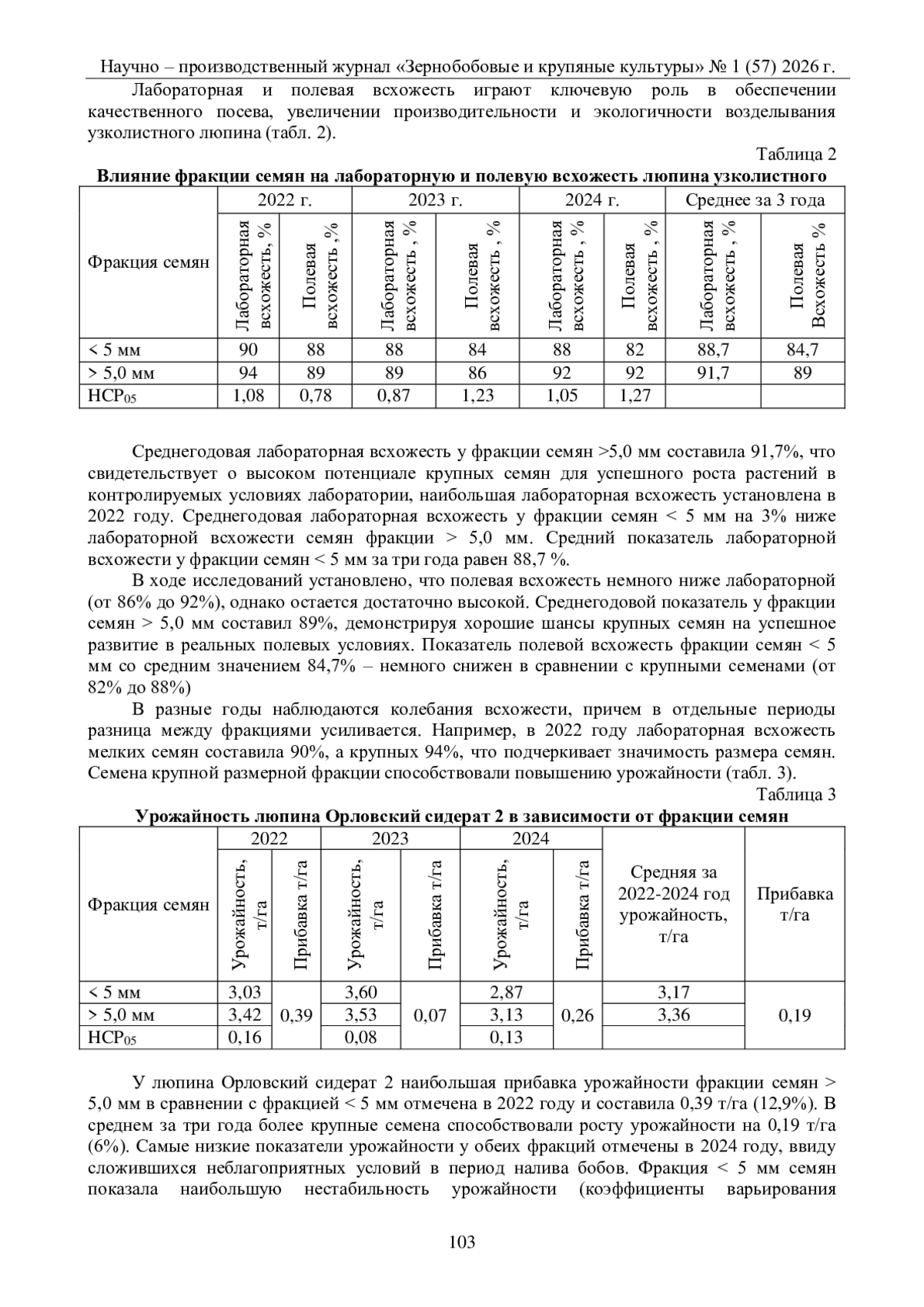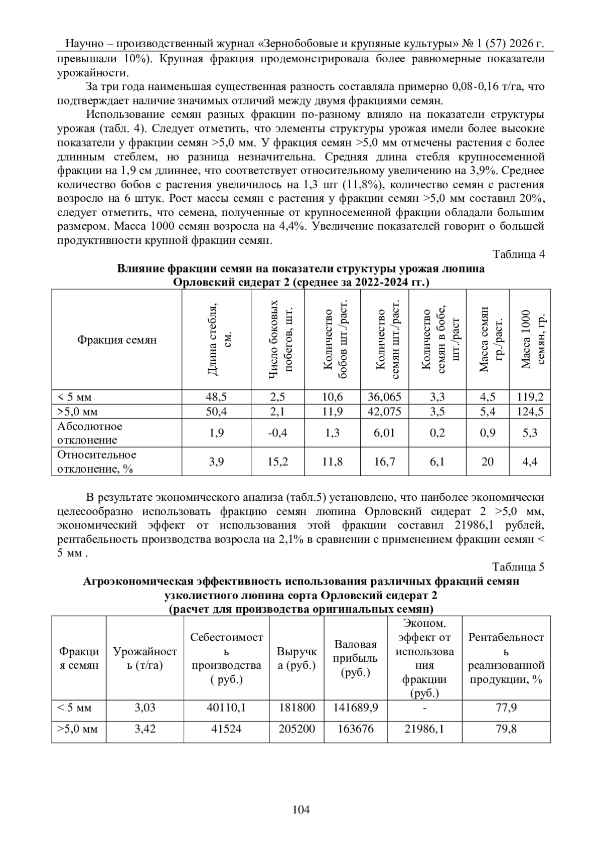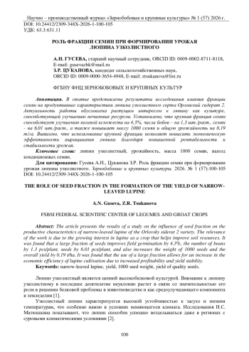 В статье представлены результаты исследования влияния фракции семян на продуктивные характеристики люпина узколистного сорта Орловский сидерат 2. Актуальность работы обусловлена растущим интересом к люпину как культуре, способствующей улучшению почвенных ресурсов. Установлено, что крупная фракция семян способствует улучшению полевой всхожести на 4,3%, числа бобов – на 1,3 шт./раст., семян - на 6,01 шт./раст., а также повышает массу 1000 семян и общую урожайность на 0,19 т/га. Выявлено, что использование крупной фракции позволяет повысить экономическую эффективность выращивания люпина благодаря повышенной рентабельности и стабильности урожая.