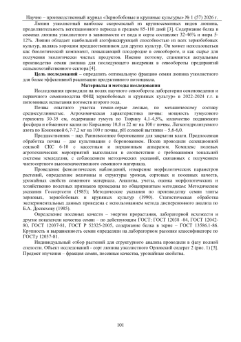 В ходе исследований изучены фенологические особенности развития растений, морфологические признаки, элементы структуры урожая и показатели продуктивности. Для оценки засухоустойчивости использован комплекс интегральных индексов (STI, GMP, HM, MP, TOL, SSI, K1SYI, K2SY), а также проведён корреляционный анализ взаимосвязей между урожайностью и индексами устойчивости в стрессовых и благоприятных условиях.