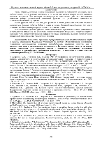 4. Агеева П.А., Почутина Н.А., Матюхина М.В. Люпин узколистный - источник ценных питательных веществ для использования в кормопроизводстве. // Кормопроизводство. - 2020. - № 10. - С. 29-33.