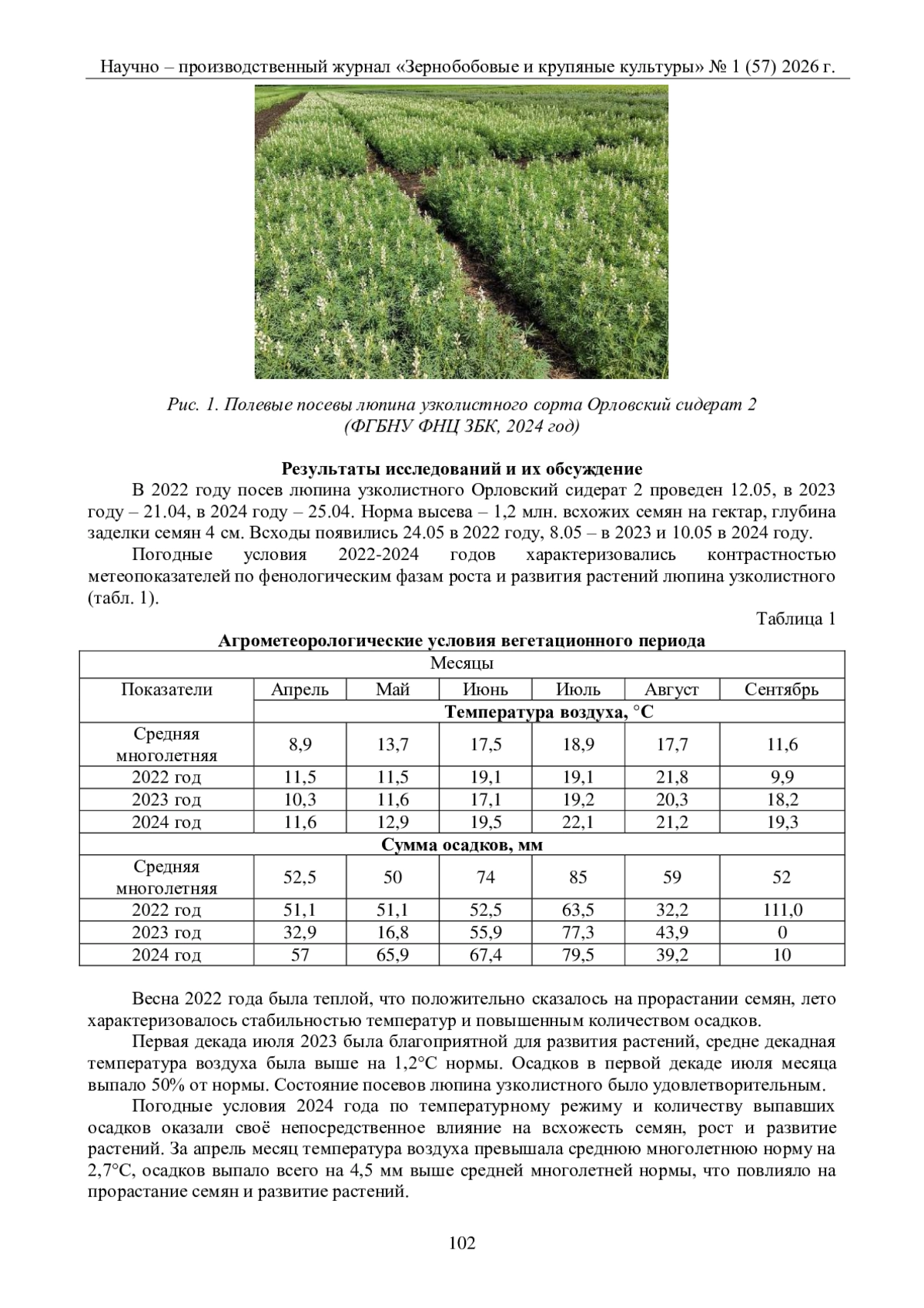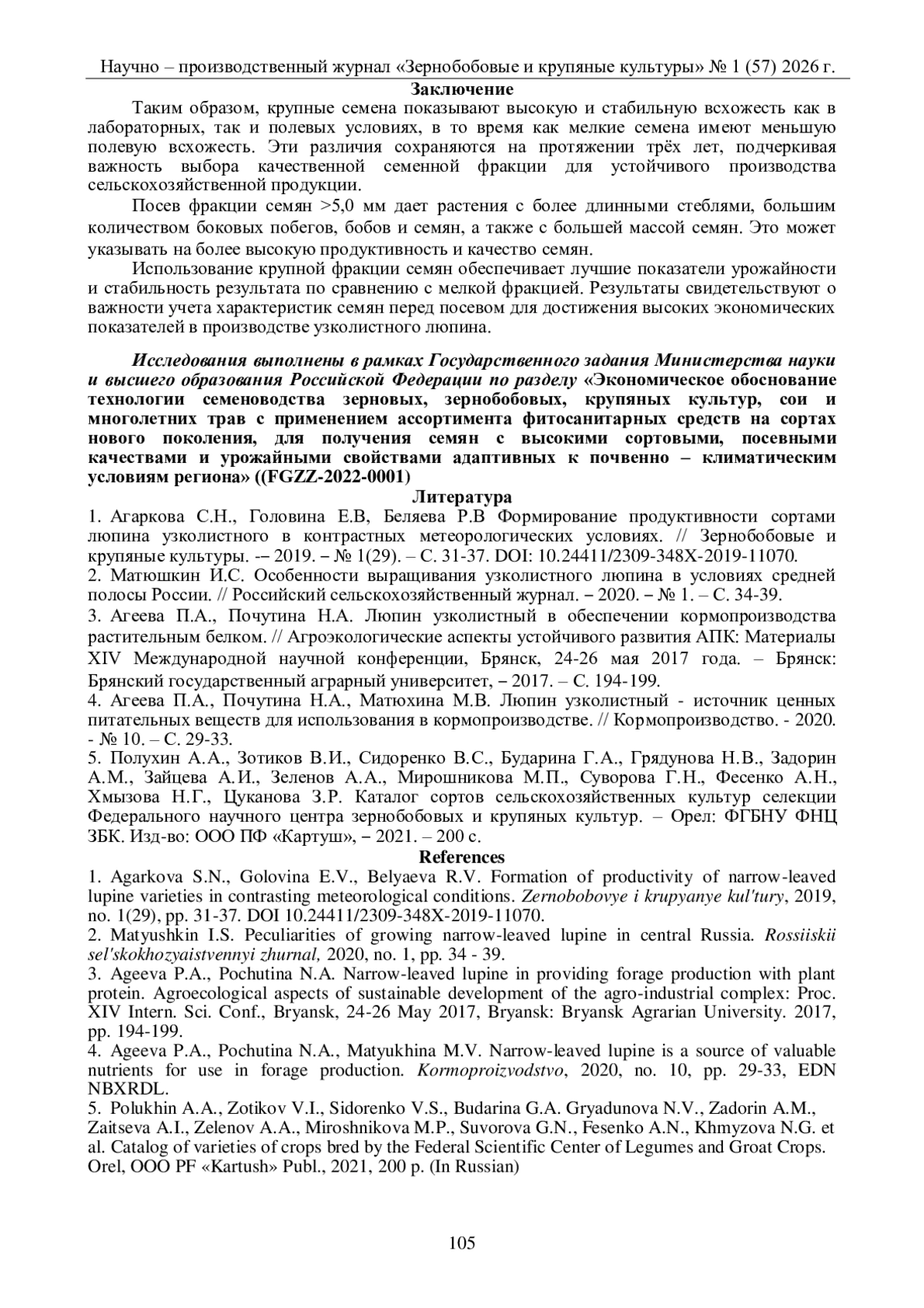 1. Агаркова С.Н., Головина Е.В, Беляева Р.В Формирование продуктивности сортами люпина узколистного в контрастных метеорологических условиях. // Зернобобовые и крупяные культуры. - 2019. - № 1(29). - С. 31-37. DOI: 10.24411/2309-348X-2019-11070