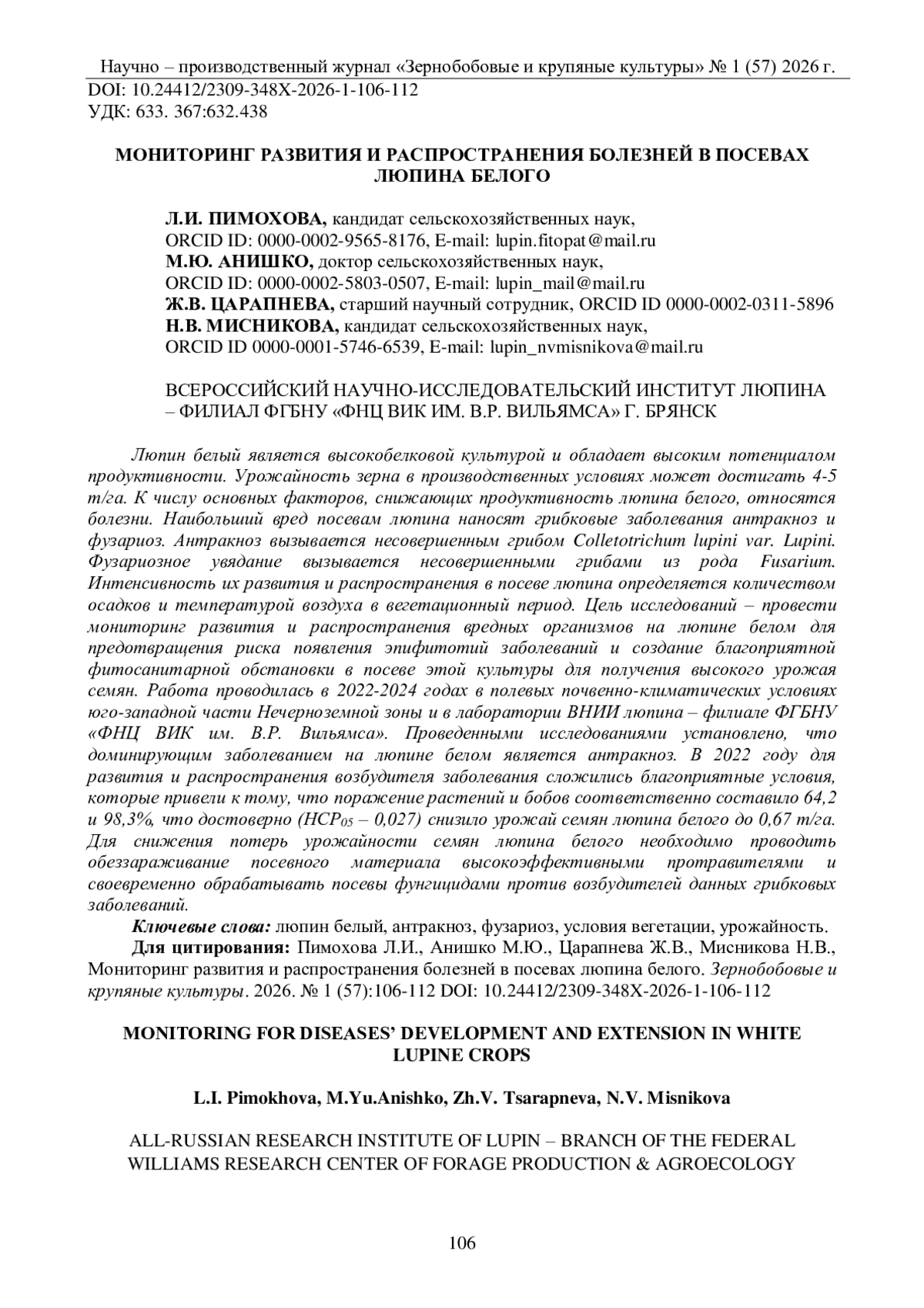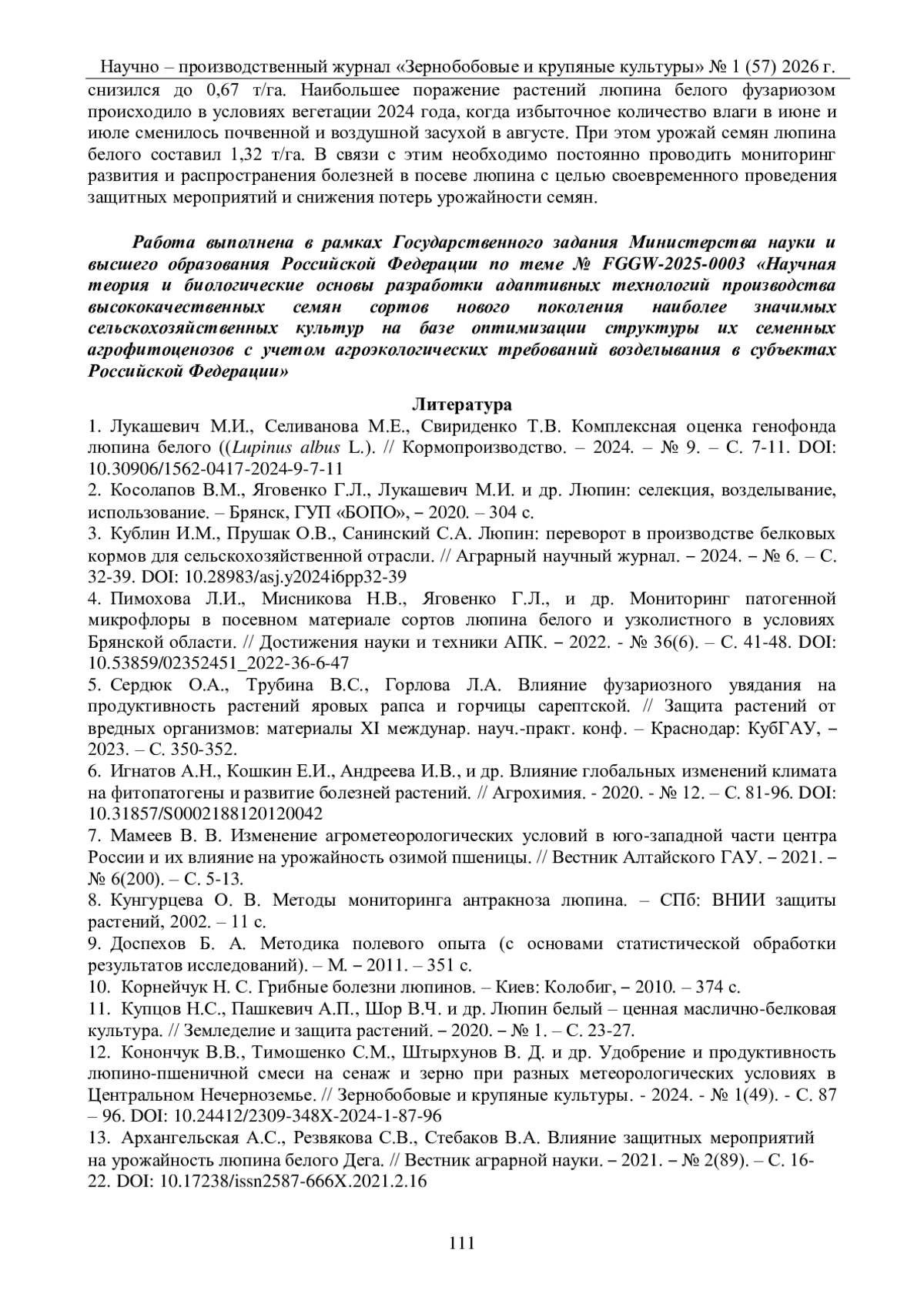 4. Пимохова Л.И., Мисникова Н.В., Яговенко Г.Л., и др. Мониторинг патогенной микрофлоры в посевном материале сортов люпина белого и узколистного в условиях Брянской области. // Достижения науки и техники АПК. - 2022. - № 36(6). - С. 41-48. DOI: 10.53859/02352451_2022-36-6-47