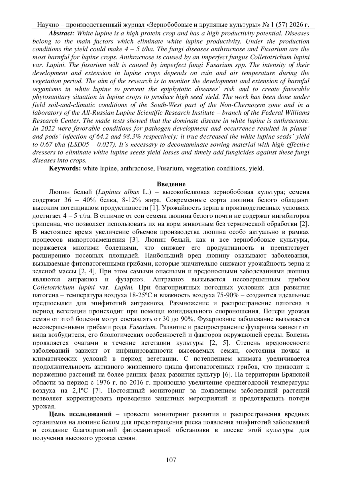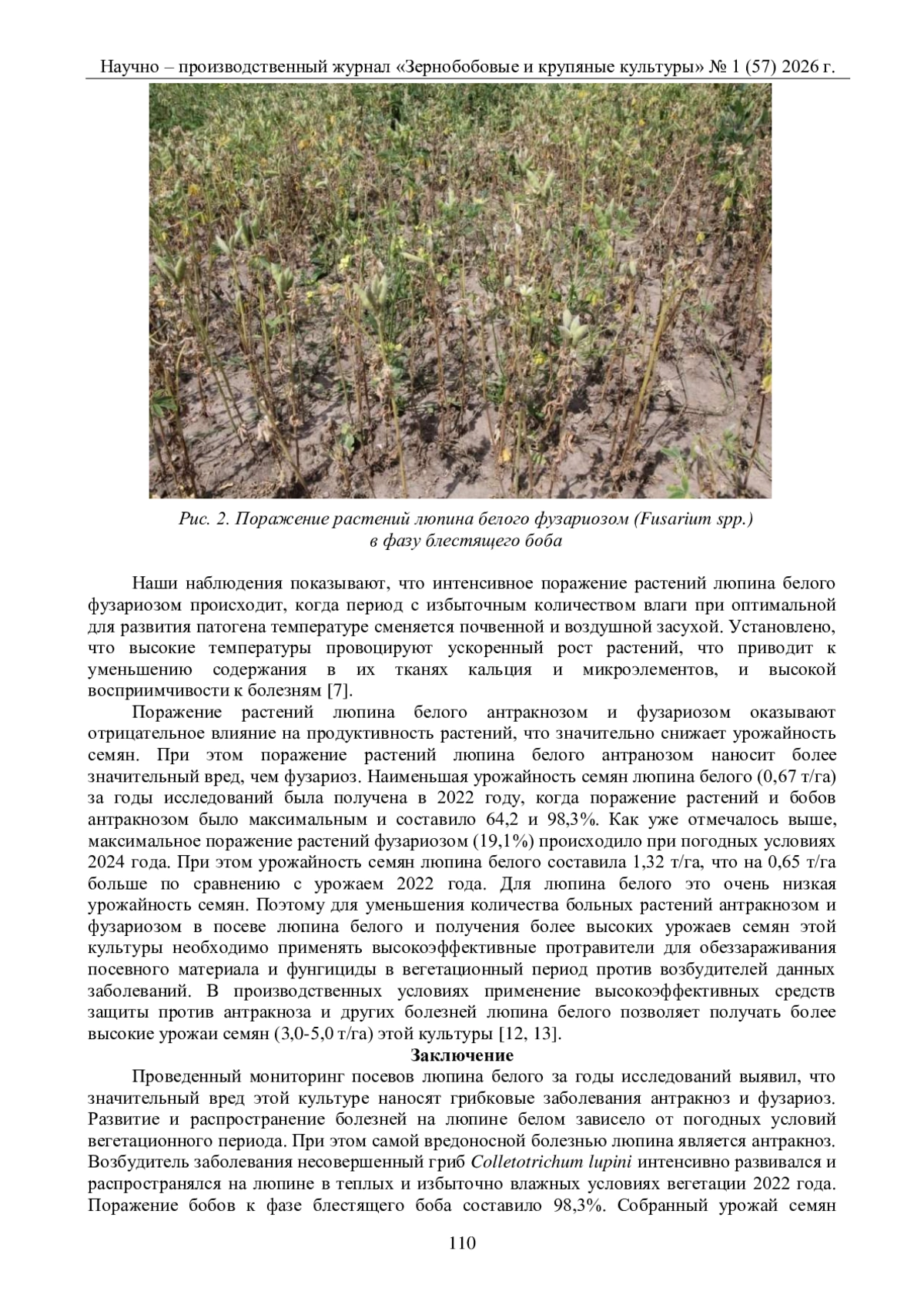 Люпин белый является высокобелковой культурой и обладает высоким потенциалом продуктивности. Урожайность зерна в производственных условиях может достигать 4-5 т/га. К числу основных факторов, снижающих продуктивность люпина белого, относятся болезни. Наибольший вред посевам люпина наносят грибковые заболевания антракноз и фузариоз. Антракноз вызывается несовершенным грибом Colletotrichum lupini var. Lupini. Фузариозное увядание вызывается несовершенными грибами из рода Fusarium. Интенсивность их развития и распространения в посеве люпина определяется количеством осадков и температурой воздуха в вегетационный период. Цель исследований – провести мониторинг развития и распространения вредных организмов на люпине белом для предотвращения риска появления эпифитотий заболеваний и создание благоприятной фитосанитарной обстановки в посеве этой культуры для получения высокого урожая семян. Работа проводилась в 2022-2024 годах в полевых почвенно-климатических условиях юго-западной части Нечерноземной зоны и в лаборатории ВНИИ люпина – филиале ФГБНУ «ФНЦ ВИК им. В. Р. Вильямса». Проведенными исследованиями установлено, что доминирующим заболеванием на люпине белом является антракноз. В 2022 году для развития и распространения возбудителя заболевания сложились благоприятные условия, которые привели к тому, что поражение растений и бобов соответственно составило 64,2 и 98,3%, что достоверно (НСР05 – 0,027) снизило урожай семян люпина белого до 0,67 т/га. Для снижения потерь урожайности семян люпина белого необходимо проводить обеззараживание посевного материала высокоэффективными протравителями и своевременно обрабатывать посевы фунгицидами против возбудителей данных грибковых заболеваний.