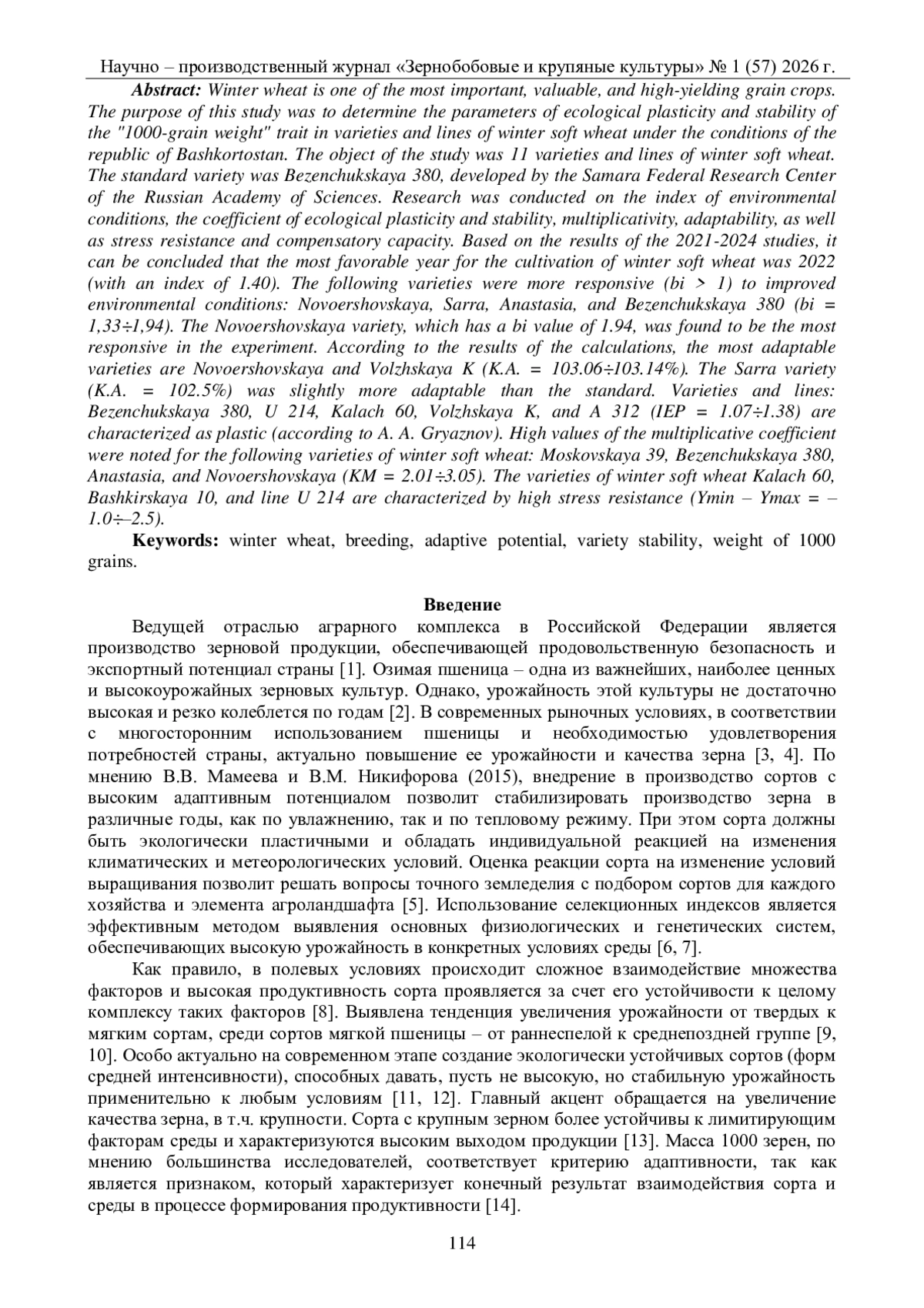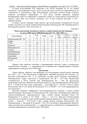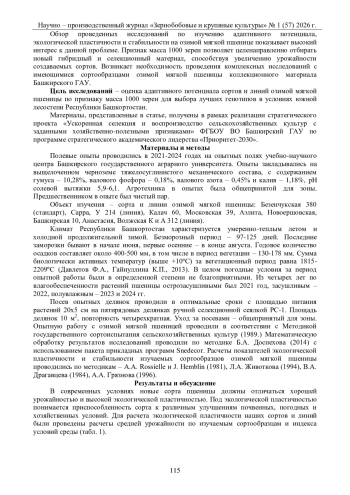 Озимая пшеница – одна из важнейших, наиболее ценных и высокоурожайных зерновых культур. Целью исследований являлось определение параметров экологической пластичности и стабильности признака масса 1000 зерен у сортов и линий озимой мягкой пшеницы в условиях Республики Башкортостан. Объект исследований – 11 сортов и линий озимой мягкой пшеницы. Проведены исследования индекса условий среды, коэффициента экологической пластичности и стабильности, мультипликативности, адаптивности, а также устойчивости к стрессу и компенсаторной способности. По результатам исследований 2021-2024 гг. можно сделать вывод, что наиболее благоприятным для возделывания озимой мягкой пшеницы был 2022 г. (с индексом среды 1,40). Большей отзывчивостью (bi> 1) на улучшение условий среды обладали сортообразцы: Новоершовская, Сарра, Анастасия и Безенчукская 380 (bi = 1,33÷1,94). Наибольшей отзывчивостью в опыте отмечен сорт Новоершовская имеющий bi = 1,94. По результатам проведенных расчетов, наиболее пластичными являются сорта Новоершовская и Волжская К (К. А. = 103,06÷103,14%). Менее адаптивным оказался сорт Сарра (К. А. = 102,5%), слегка превысив стандарт. Сорта и линии: Безенчукская 380, У 214, Калач 60, Волжская К и А 312 (ИЭП = 1,07÷1,38) характеризуются как пластичные (по А. А. Грязнову). Высокие значения коэффициента мультипликативности отмечены у сортов озимой мягкой пшеницы: Московская 39, Безенчукская 380, Анастасия и Новоершовская (КМ = 2,01÷3,05). Высокой стрессоустойчивостью характеризуются сорта озимой мягкой пшеницы Калач 60, Башкирская 10 и линия У 214 (Ymin – Ymax = –1,0÷–2,5)