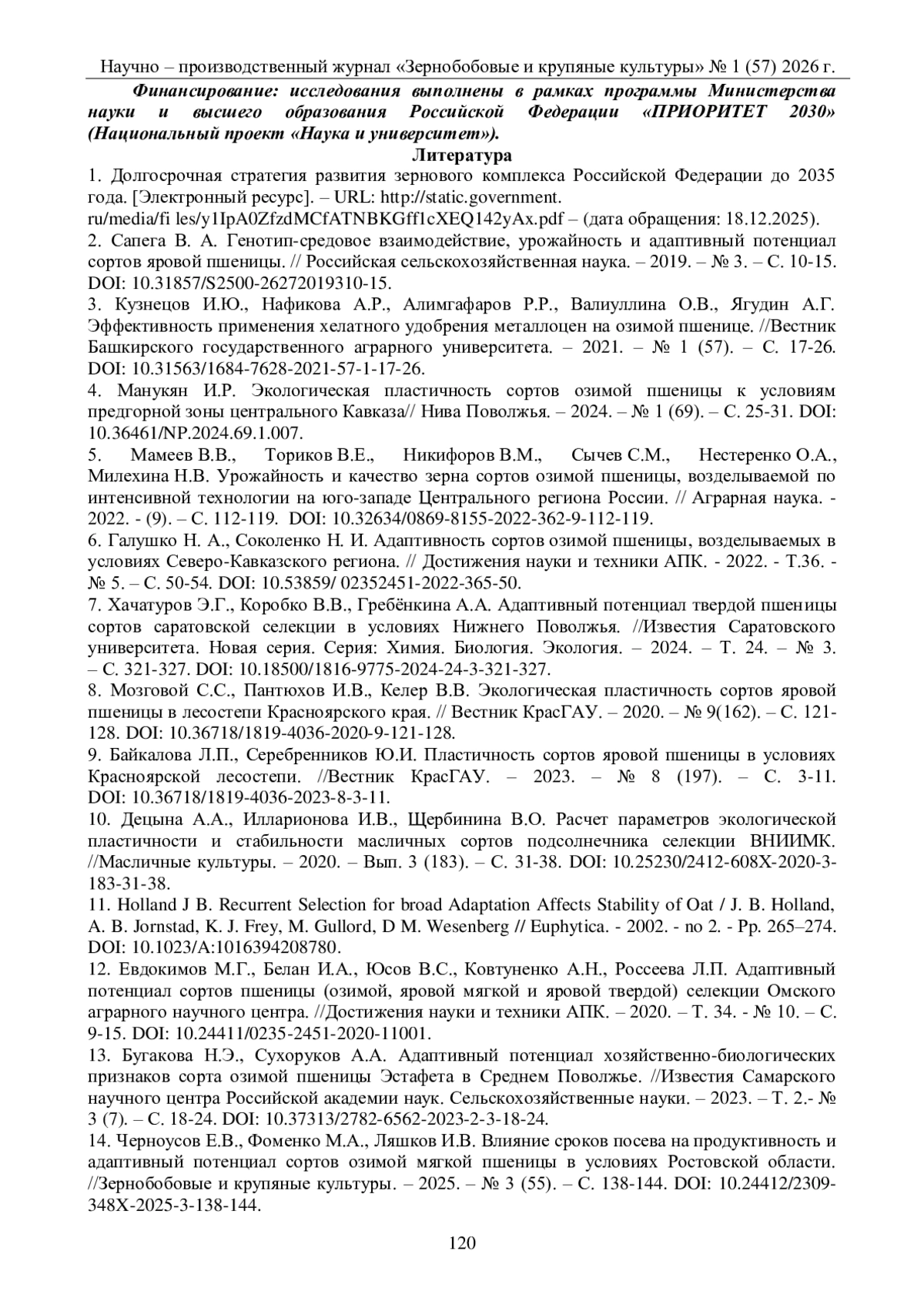 Ведущей отраслью аграрного комплекса в Российской Федерации является производство зерновой продукции, обеспечивающей продовольственную безопасность и экспортный потенциал страны [1]. Озимая пшеница – одна из важнейших, наиболее ценных и высокоурожайных зерновых культур. Однако, урожайность этой культуры не достаточно высокая и резко колеблется по годам [2]. В современных рыночных условиях, в соответствии с многосторонним использованием пшеницы и необходимостью удовлетворения потребностей страны, актуально повышение ее урожайности и качества зерна [3, 4]. По мнению В. В. Мамеева и В. М. Никифорова (2015), внедрение в производство сортов с высоким адаптивным потенциалом позволит стабилизировать производство зерна в различные годы, как по увлажнению, так и по тепловому режиму. При этом сорта должны быть экологически пластичными и обладать индивидуальной реакцией на изменения климатических и метеорологических условий. Оценка реакции сорта на изменение условий выращивания позволит решать вопросы точного земледелия с подбором сортов для каждого хозяйства и элемента агроландшафта [5]. Использование селекционных индексов является эффективным методом выявления основных физиологических и генетических систем, обеспечивающих высокую урожайность в конкретных условиях среды [6, 7].