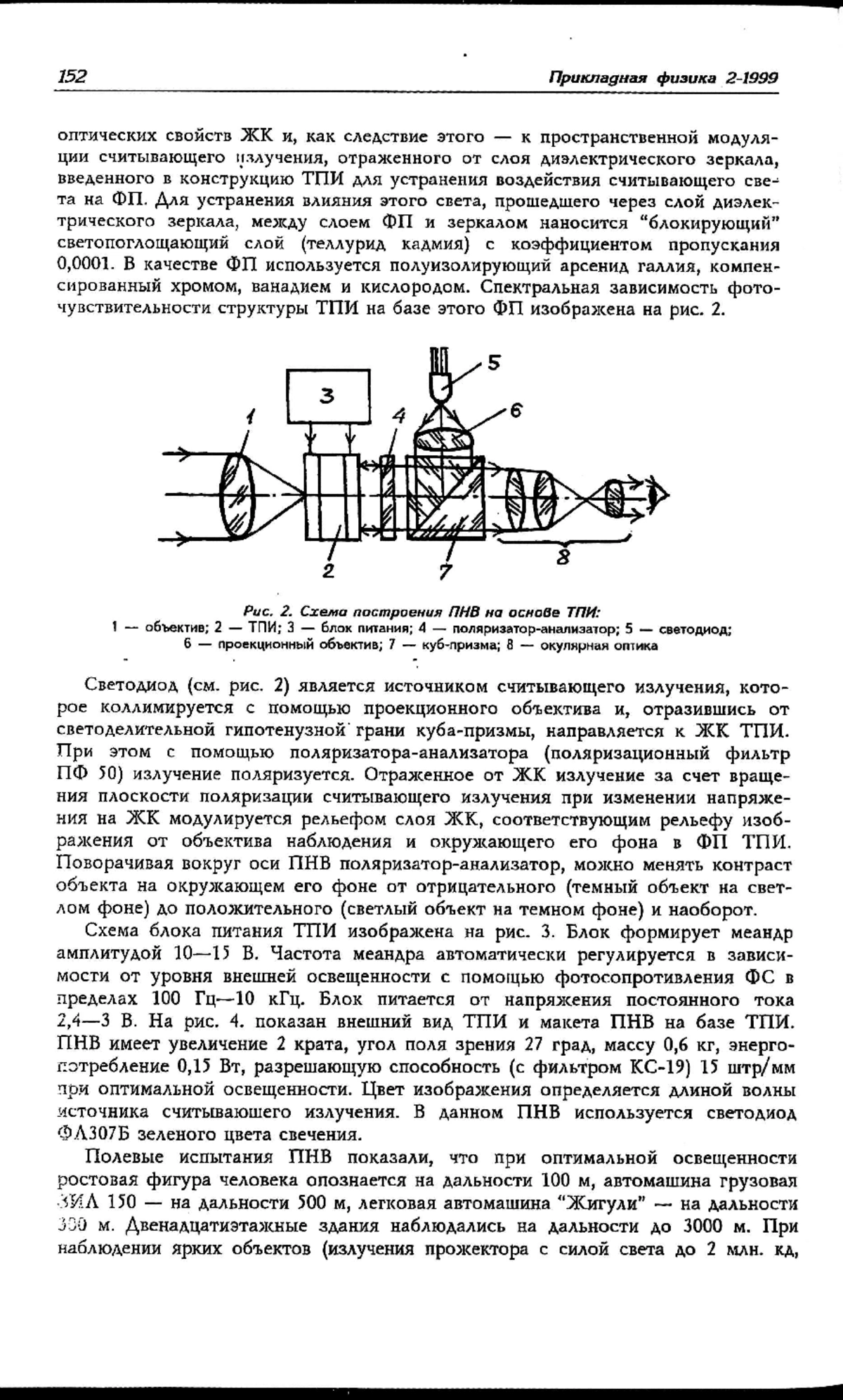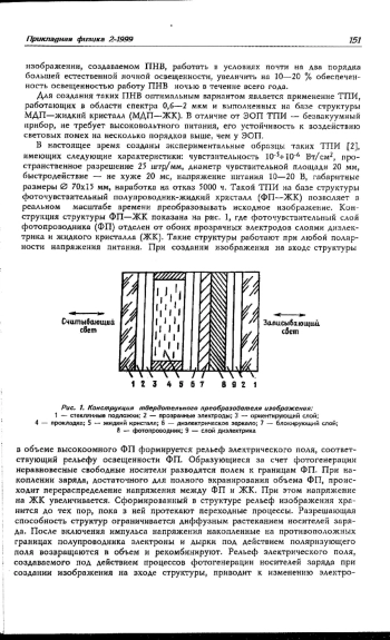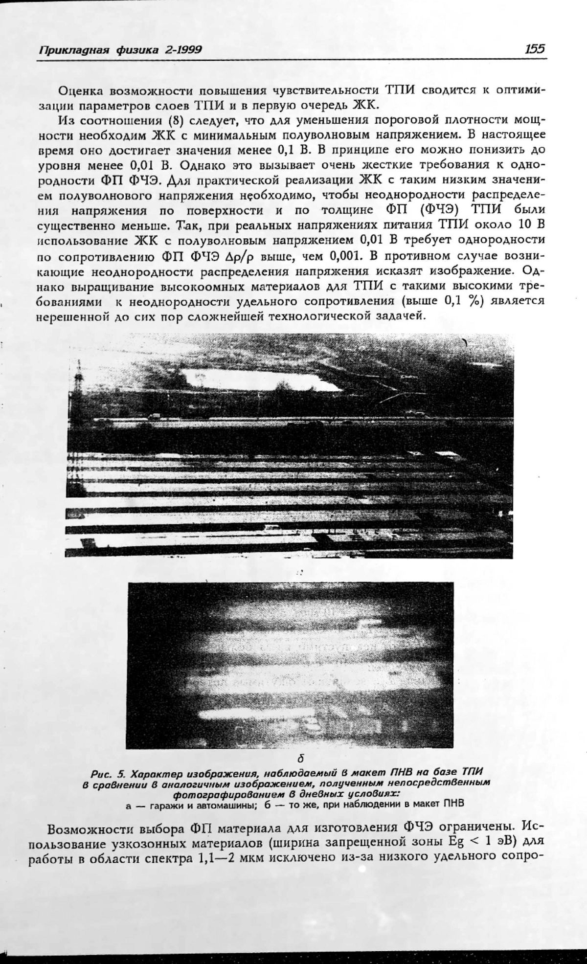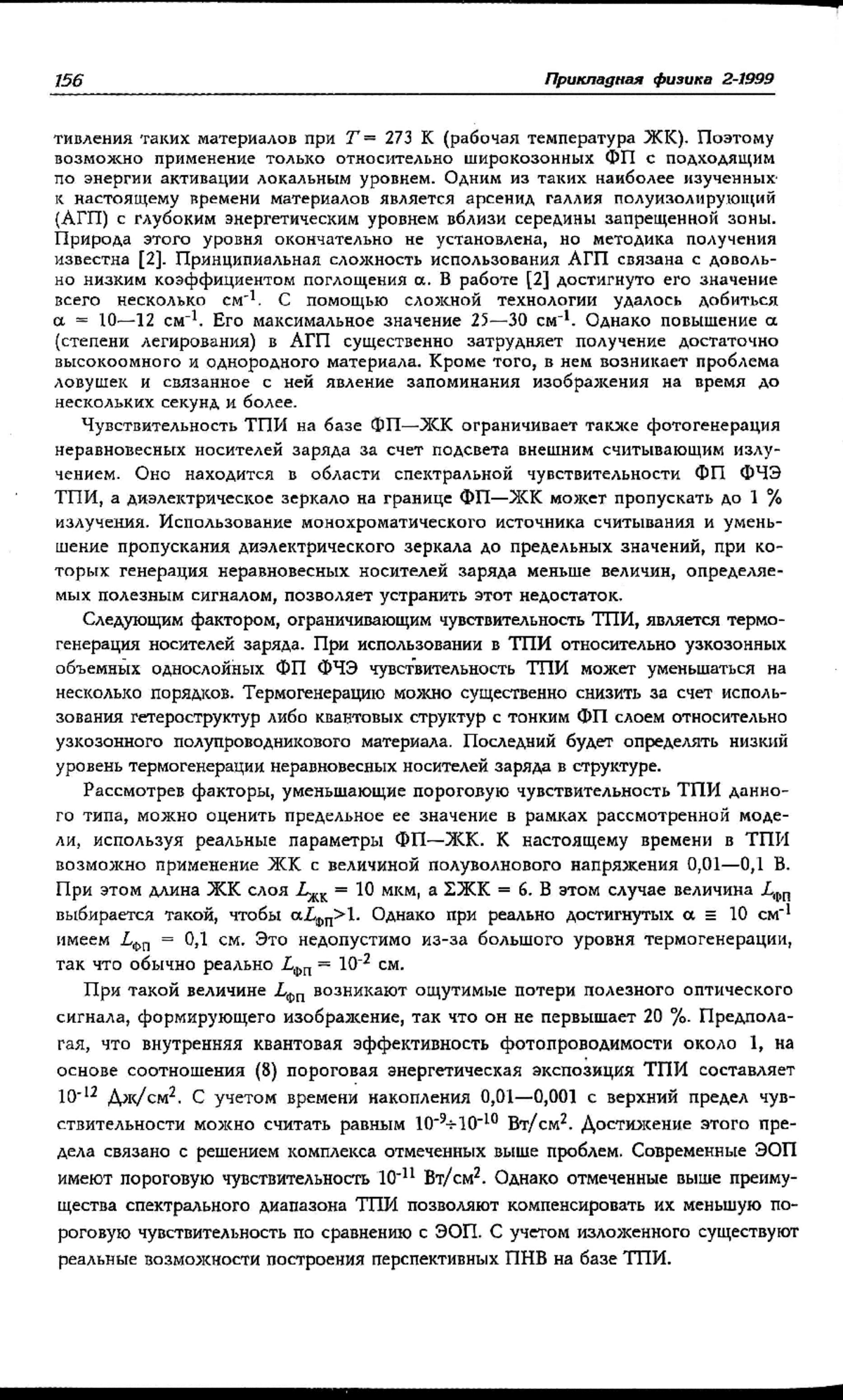 При такой величине LФП возникают ощутимые потери полезного оптического сигнала, формирующего изображение, так что он не первышает 20 %. Предполагая, что внутренняя квантовая эффективность фотопроводимости около 1, на основе соотношения (8) пороговая энергетическая экспозиция ТПИ составляет 10-12 Дж/см2. С учетом времени накопления 0,01-0,001 с верхний предел чувствительности можно считать равным 10-9-10-10 Вт/см2. Достижение этого предела связано с решением комплекса отмеченных выше проблем. Современные ЭОП имеют пороговую чувствительность 10-11 Вт/см2. Однако отмеченные выше преимущества спектрального диапазона ТПИ позволяют компенсировать их меньшую пороговую чувствительность по сравнению с ЭОП. С учетом изложенного существуют реальные возможности построения перспективных ПНВ на базе ТПИ.