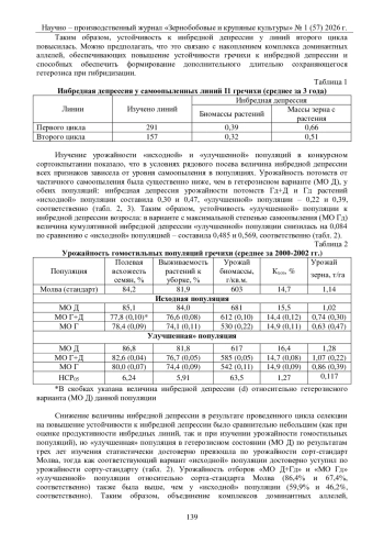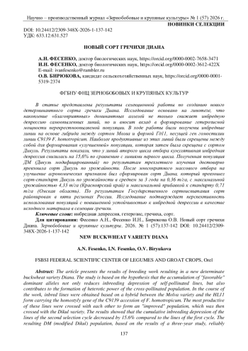 В статье представлены результаты селекционной работы по созданию нового детерминантного сорта гречихи Диана. Исследование основано на гипотезе, что накопление «благоприятных» доминантных аллелей не только снижает инбредную депрессию самоопыленных линий, но и вносит вклад в формирование гетерозисной мощности перекрестноопыляемой популяции. В ходе работы были получены инбредные линии на основе гибрида между сортом Молва и формой Гд11, несущей ген гомостилии линии С9139 F. homotropicum. Наиболее продуктивные из этих линий были скрещены между собой для формирования «улучшенной» популяции, которая затем была скрещена с сортом Дикуль. Результаты показали, что у линий второго цикла отбора кумулятивная инбредная депрессия снизилась на 15,6% по сравнению с линиями первого цикла. Полученная популяция ДМ (Дикуль модифицированный) по результатам трехлетнего изучения достоверно превзошла сорт Дикуль по урожайности. После многократного массового отбора на улучшение агрономических признаков был сформирован сорт Диана, который превзошел сорт-стандарт Дикуль по урожайности в среднем за 3 года на 0,36 т/га, с максимальной урожайностью 4,33 т/га (Красноярский край) и максимальной прибавкой к стандарту 0,71 т/га (Омская область). По результатам Государственного сортоиспытания сорт районирован в пяти регионах России. Исследование подтверждает перспективность использования популяций с повышенной устойчивостью к инбредной депрессии в качестве исходного материала в селекции гречихи.