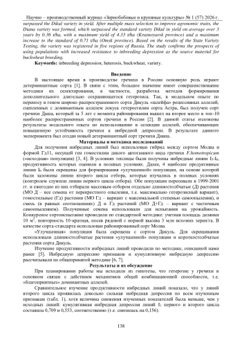 В настоящее время в производстве гречихи в России основную роль играют детерминантные сорта [1]. В связи с этим, большое значение имеет совершенствование методики их селектирования, в частности, разработка методов формирования дополнительного длительно сохраняющегося гетерозиса. Так, в модельном опыте по переносу в геном широко распространенного сорта Дикуль «шлейфа» рецессивных аллелей, сцепленных с доминантным аллелем локуса гетеростилии сорта Астра, был получен сорт гречихи Даша, который за 5 лет с момента районирования вышел на второе место в топ-10 наиболее распространенных сортов гречихи в России [2]. В данной статье изложены результаты модельного опыта по использованию в селекции аллелей, обеспечивающих повышенную устойчивость гречихи к инбредной депрессии. В результате данного эксперимента был создан новый детерминантный сорт гречихи Диана.