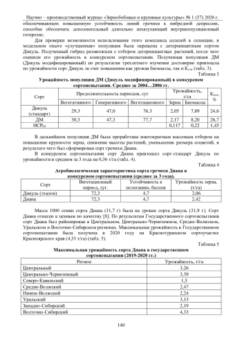 Исследования выполняли с целью оценки урожайности и показателей адаптивных свойств разных морфотипов сортов гречихи в различных погодных условиях юго-восточной зоны Орловской области. Наибольший урожай зерна 2,1 т/га сформировал в 2025 году детерминантный сорт Диана (ФНЦ зернобобовых и крупяных культур), самый низкий в 2024 году – 0,9 т/га индетерминантный – Зилимская (ФГБНУ Уфимский ФИЦ РАН). В среднем за четыре года детерминантный сорт Диана превысил по урожайности сорта (т/га): Темп на 0,2, Девятку – на 0,5, Башкирскую красностебельную – на 0,6, Землячку – на 0,4, Зилимскую – на 0,7 и Яшлек – на 0,5. Среди изучаемых в 2022-2025 гг. выделен наиболее адаптированный к условиям юго-востока Орловской области сорт детерминантного морфотипа Диана, обладающий высокими показателями продуктивности – 1,9 т/га и адаптивных свойств: генетической гибкости (2,65 т/га), коэффициента адаптивности (КА= 1,65), гомеостатичности (Ноm = 0,19), селекционной ценности (Sc=1,45), меньшим значением суммы (Σ рангов=20). Индетерминантный сорт гречихи Зилимская с низкой за четырехлетний период урожайностью (1,2 т/га), имеющий невысокие значения генетической гибкости (1,65 т/га), коэффициента адаптивности (КА= 0,79), гомеостатичности (Ноm = 0,07), селекционной ценности (Sc=0,07), высокой вариабельностью (V =18%) и большей суммой (Σ рангов=43) менее соответствовал условиям юго-востока региона. Выявлены статистически достоверные положительные корреляционные зависимости между средней урожайностью и коэффициентом адаптации (КА), r0,996, компенсаторной гибкостью (Ymin + Ymax/2), r0,979; между компенсаторной гибкостью (Ymin+Ymax/2) и селекционной ценностью(Sc), r =0,957 и коэфициентом адаптивности (КА), r =0,980.