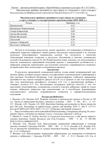 1. Фесенко А.Н., Фесенко И.Н. Развитие селекции и производства гречихи в России за 100 лет. Труды по прикладной ботанике, генетике и селекции. - 2019. - Т. 180. - № 1. - С. 113-117. (Fesenko A.N., Fesenko I.N. 2019. Buckwheat breeding and production in Russia during the past 100 years. Proceedings on applied botany, genetics and breeding, 2019, V. 180, P. 113-117. (in Russian with English summary)). DOI: 10.30901/2227-8834-2019-1-113-117