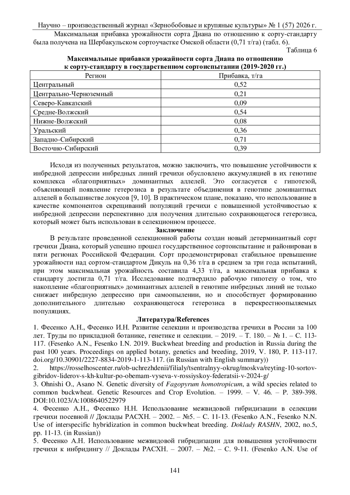 5. Фесенко А.Н. Использование межвидовой гибридизации для повышения устойчивости гречихи к инбридингу // Доклады РАСХН. - 2007. - №2. - С.9-11. (Fesenko A.N. Use of interspecific hybridization for increasing buckwheat tolerance to inbreeding.Russian Agricultural Science, 2007, V. 33, no.2, pp. 79-82. ). DOI: 10.3103/S1068367407020036