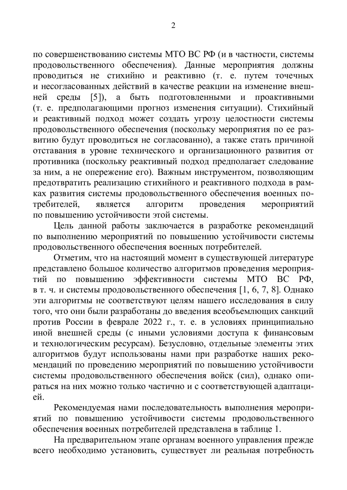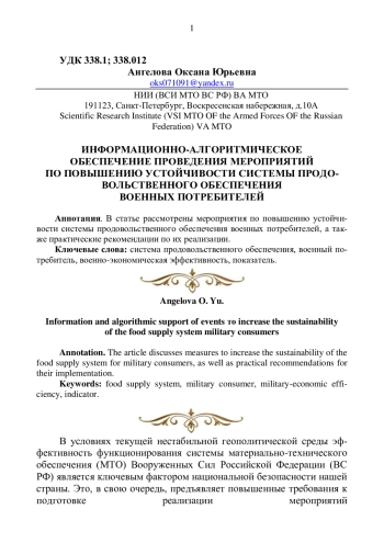 В условиях текущей нестабильной геополитической среды эффективность функционирования системы материально-технического обеспечения (МТО) Вооруженных Сил Российской Федерации (ВС РФ) является ключевым фактором национальной безопасности нашей страны. Это, в свою очередь, предъявляет повышенные требования к подготовке реализации мероприятий по совершенствованию системы МТО ВС РФ (и в частности, системы продовольственного обеспечения). Данные мероприятия должны проводиться не стихийно и реактивно (т. е. путем точечных и несогласованных действий в качестве реакции на изменение внешней среды [5]), а быть подготовленными и проактивными (т. е. предполагающими прогноз изменения ситуации).