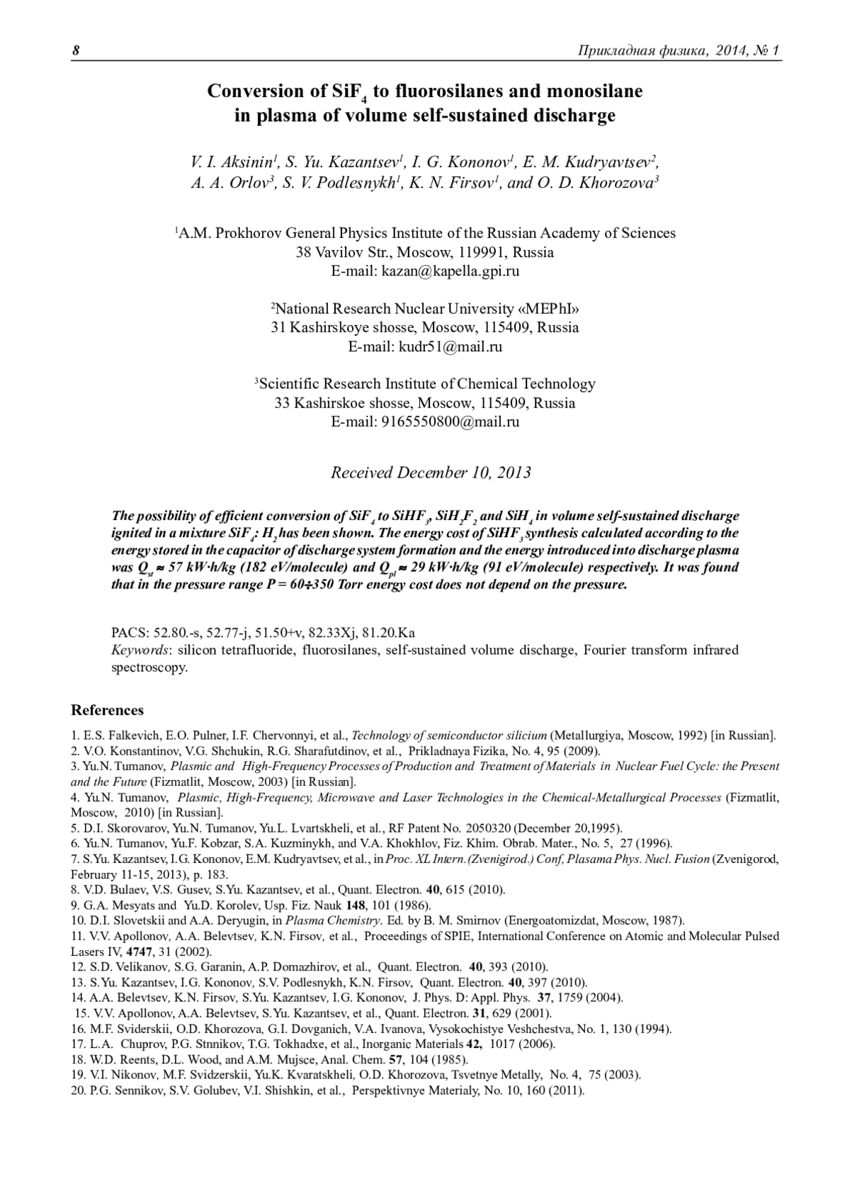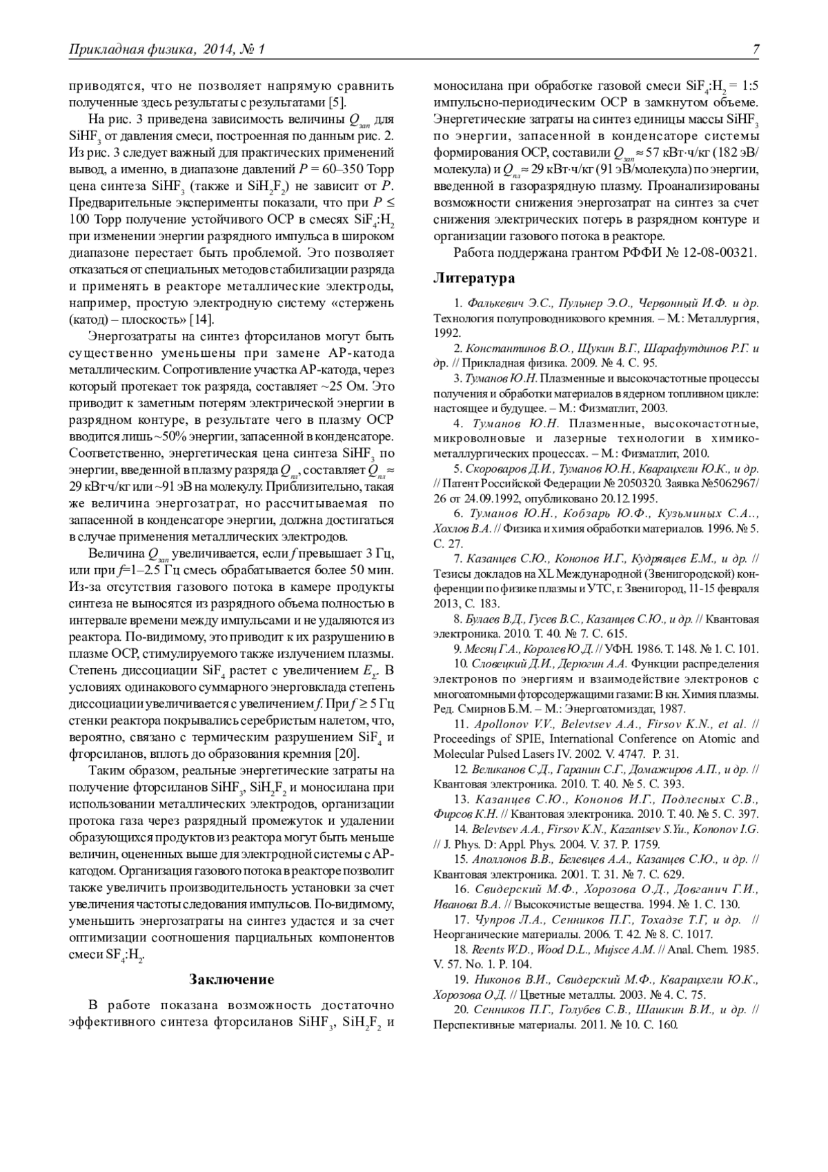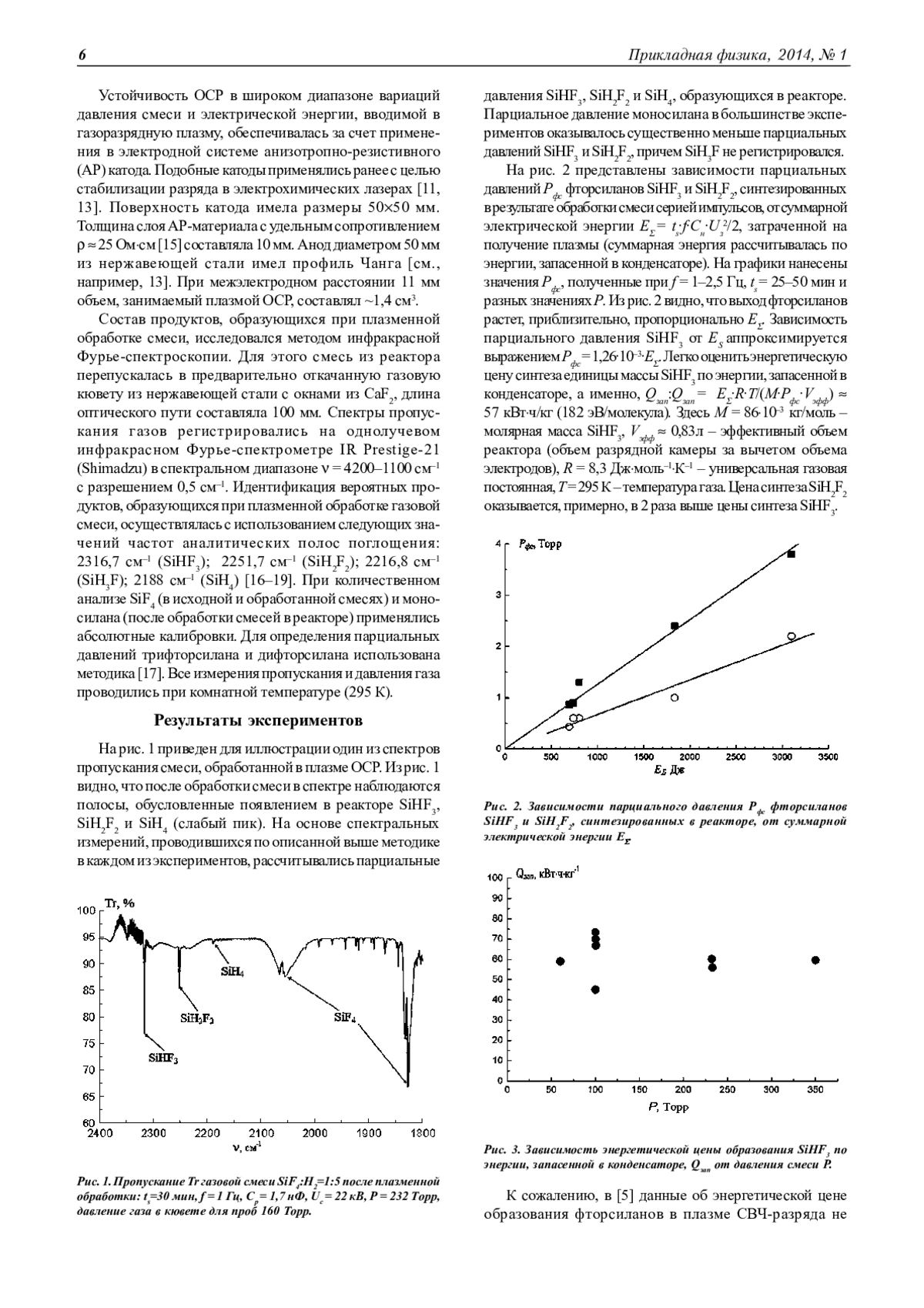 Показана возможность эффективной конверсии SiF4 в SiHF3, SiH2F2 и SiH4 в объемном самостоятельном разряде, зажигаемом в смеси SiF4: H2. Величины энергетической цены синтеза SiHF3 по энергии, запасенной в конденсаторе системы формирования разряда, и по энергии, введенной в газоразрядную плазму, составили соответственно Q ≈ 57 кВт-ч/кг (182 эВ/молекула) и Q ≈ 9 кВт-ч/кг (91 эВ/молекула). Установлено, что в диапазоне давлений смеси Р =60÷350 Торр энергетическая цена не зависит от давления.