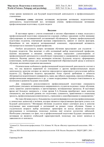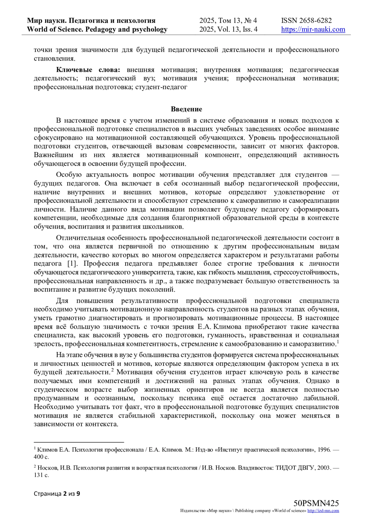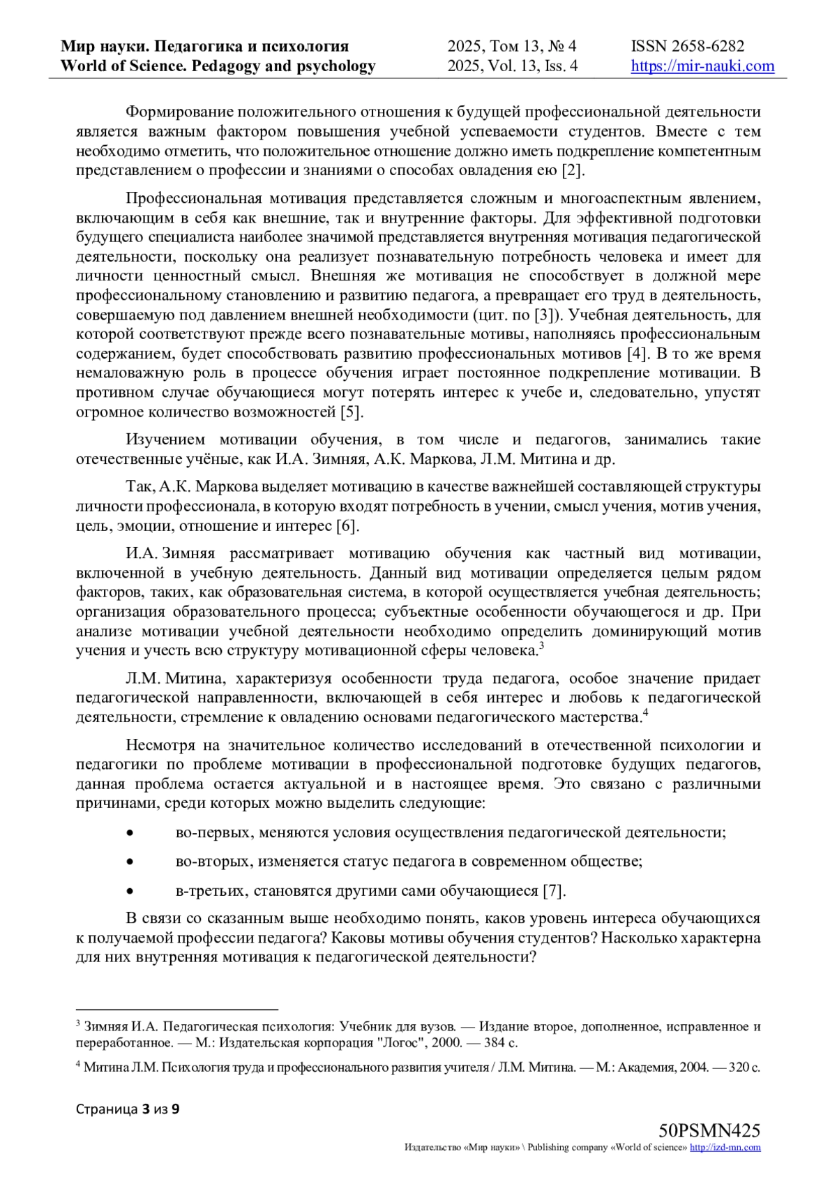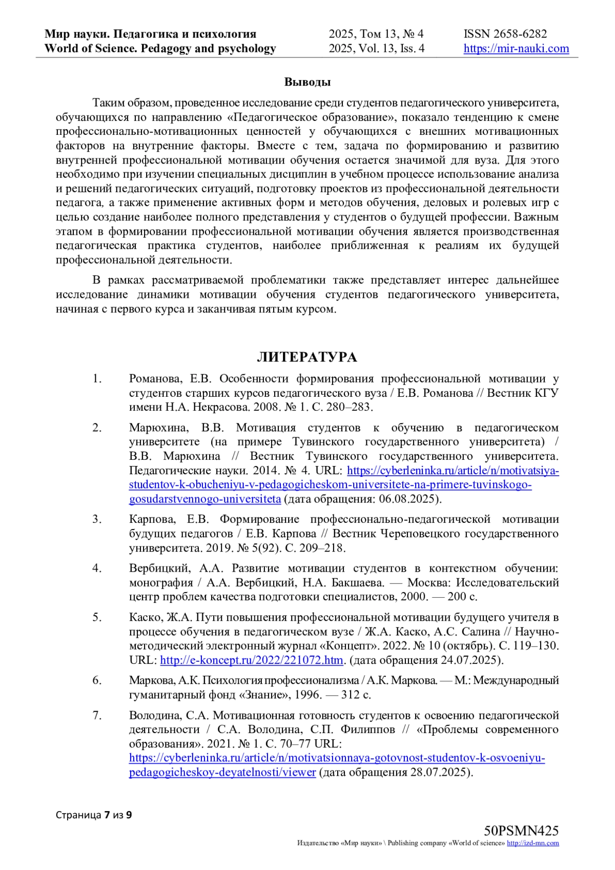 7. Володина, С.А. Мотивационная готовность студентов к освоению педагогической деятельности / С.А. Володина, С.П. Филиппов // “Проблемы современного образования”. 2021. № 1. С. 70-77 URL: https://cyberleninka.ru/article/n/motivatsionnaya-gotovnost-studentov-k-osvoeniyu-pedagogicheskoy-deyatelnosti/viewer (дата обращения 28.07.2025). EDN: QPRNBF