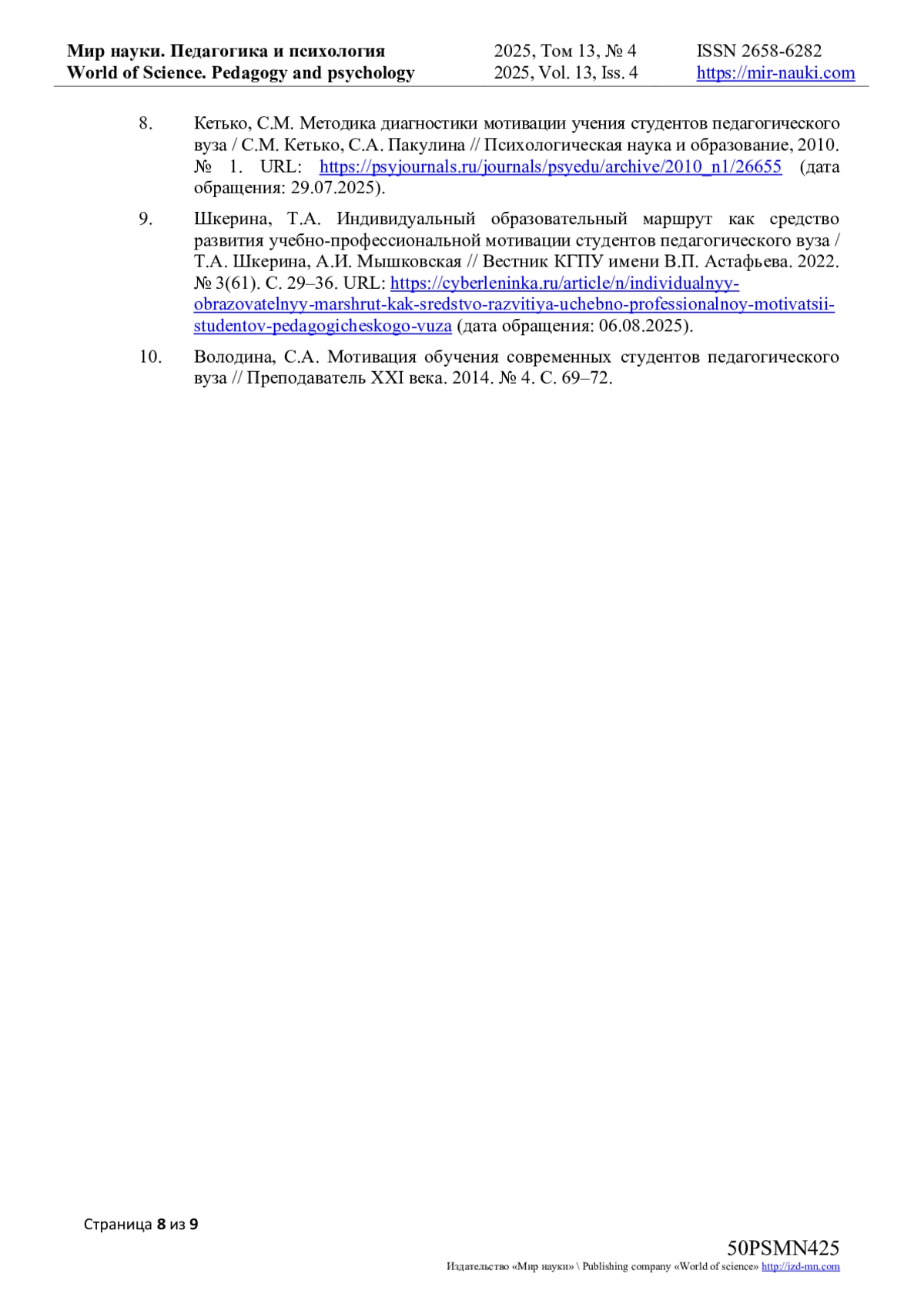 8. Кетько, С.М. Методика диагностики мотивации учения студентов педагогического вуза / С.М. Кетько, С.А. Пакулина // Психологическая наука и образование, 2010. № 1. URL: https://psyjournals.ru/journals/psyedu/archive/2010_n1/26655 (дата обращения: 29.07.2025).