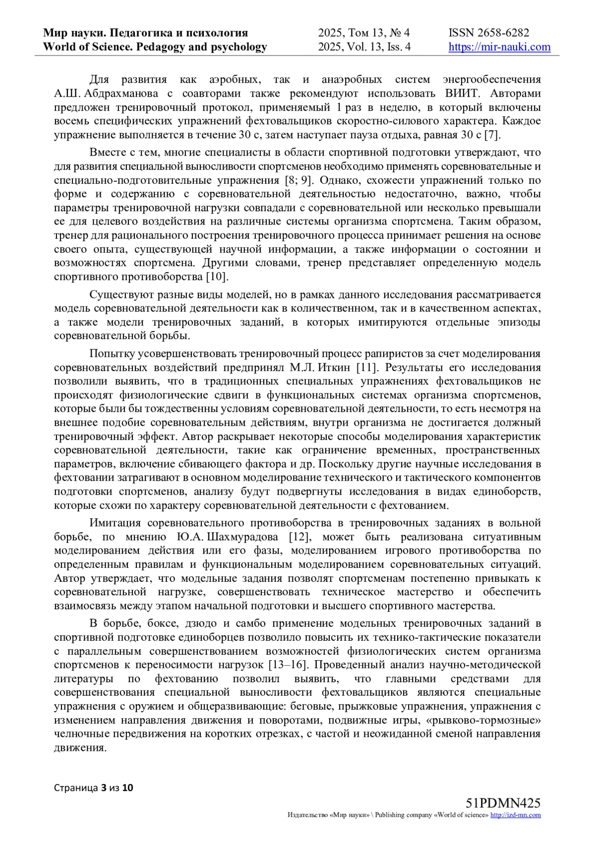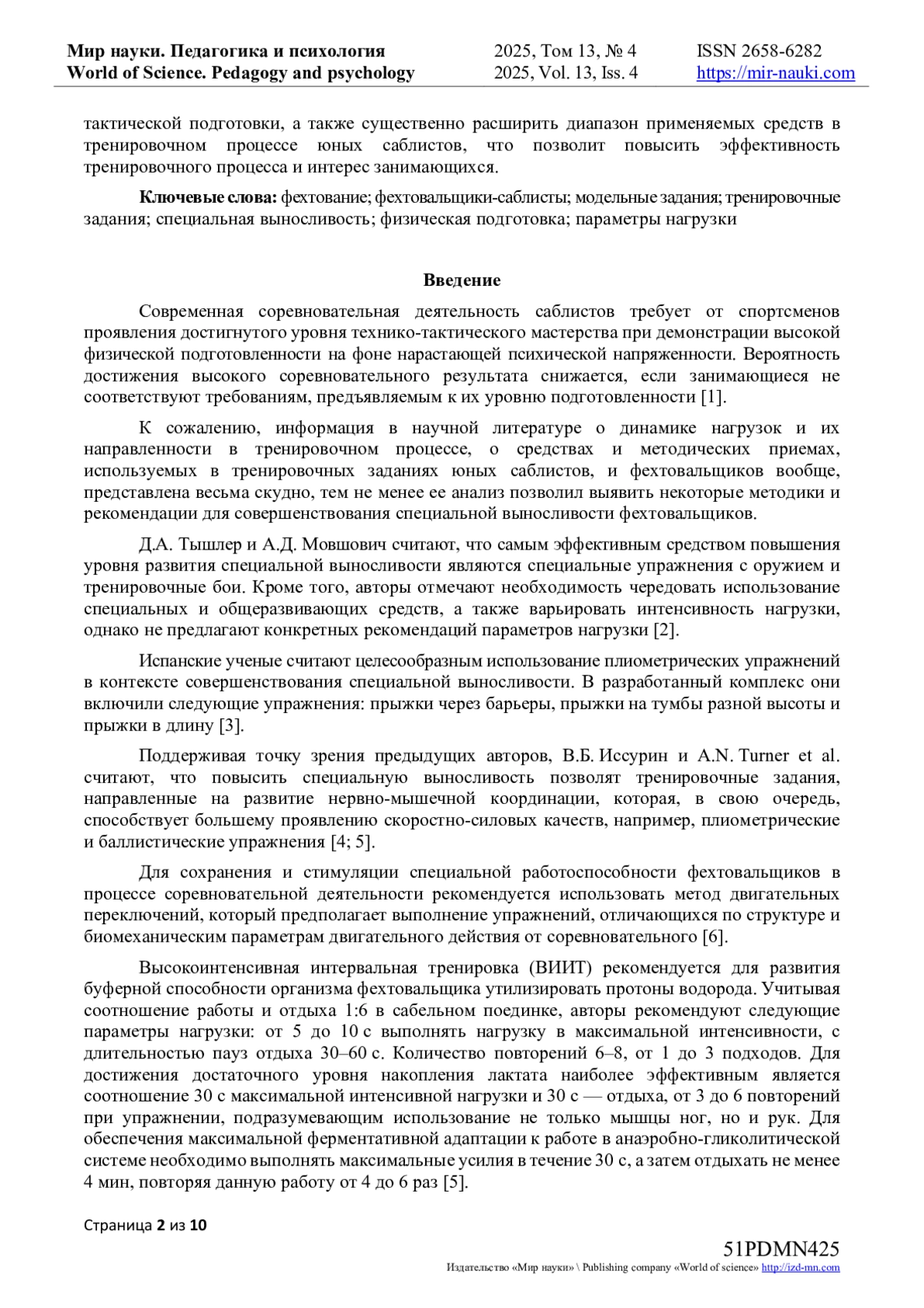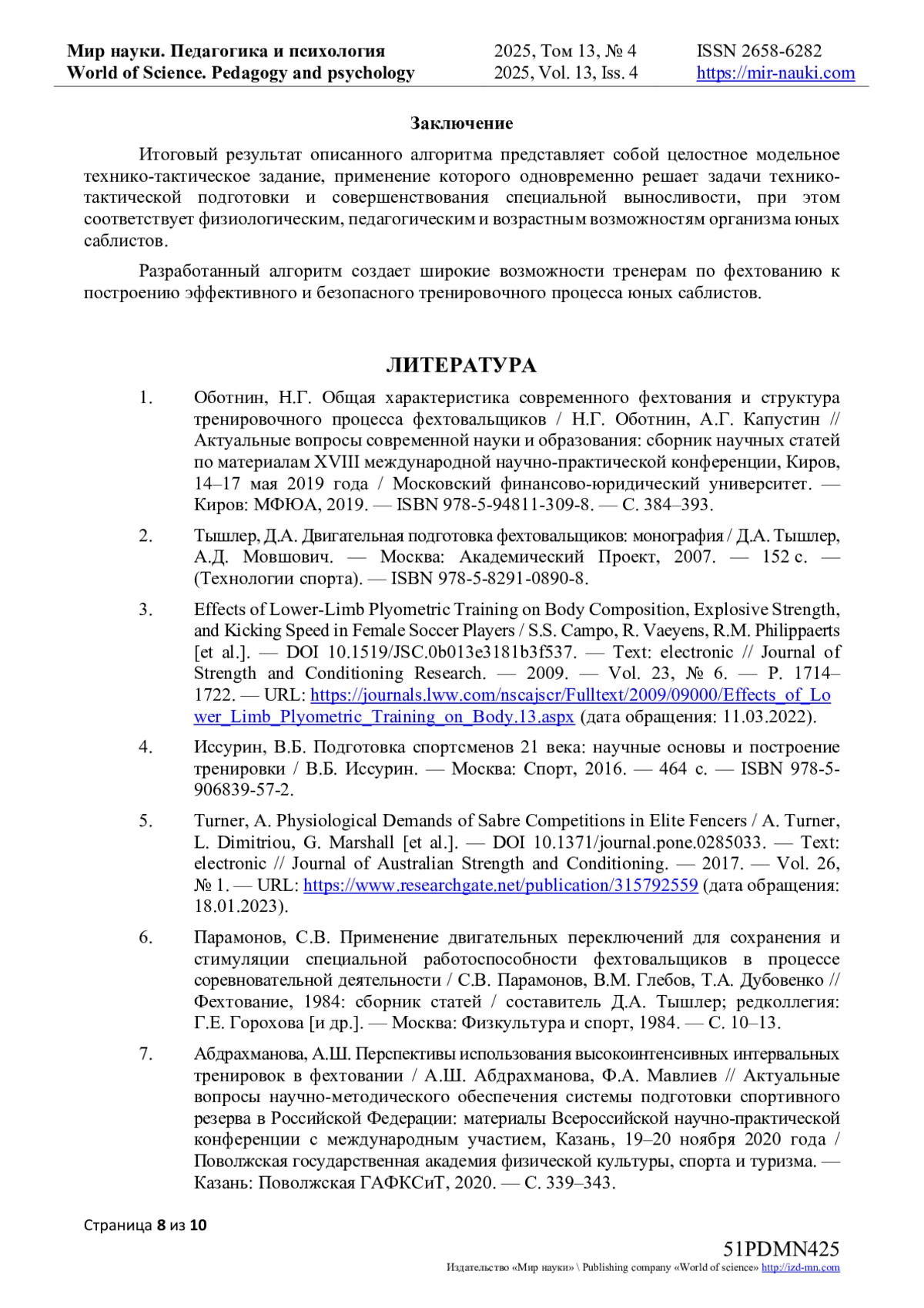 7. Абдрахманова, А.Ш. Перспективы использования высокоинтенсивных интервальных тренировок в фехтовании / А.Ш. Абдрахманова, Ф.А. Мавлиев // Актуальные вопросы научно-методического обеспечения системы подготовки спортивного резерва в Российской Федерации: материалы Всероссийской научно-практической конференции с международным участием, Казань, 19-20 ноября 2020 года / Поволжская государственная академия физической культуры, спорта и туризма. - Казань: Поволжская ГАФКСиТ, 2020. - С. 339-343. EDN: NJAVCF