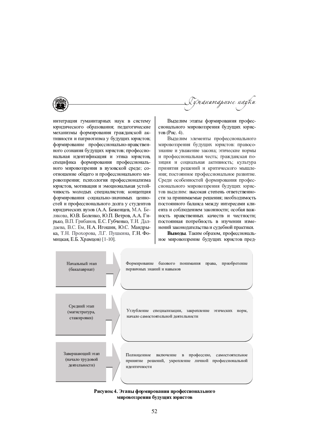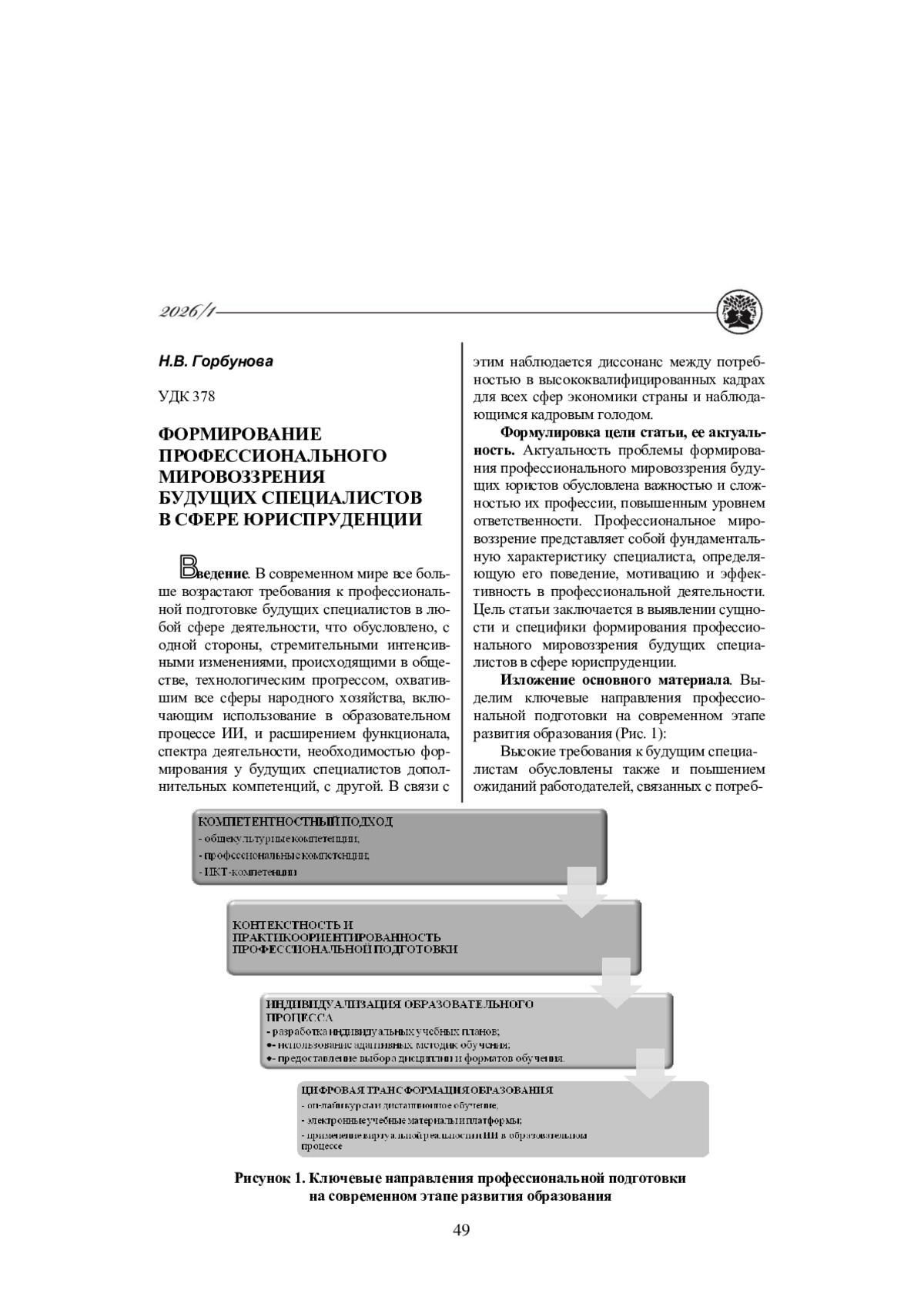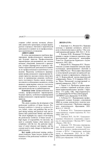 В статье рассматривается проблема формирования профессионального мировоззрения будущих юристов. Профессиональное мировоззрение рассматривается как система взглядов, убеждений, ценностей и ориентиров, которые формируются в процессе обучения и практической деятельности и влияют на их профессиональную идентичность и поведение. Выделены особенности формирования профессионального мировоззрения будущих юристов: высокая степень ответственности за принимаемые решения; необходимость постоянного баланса между интересами клиента и соблюдением законности; особая важность нравственных качеств и честности; постоянная потребность в изучении изменений законодательства и судебной практики.