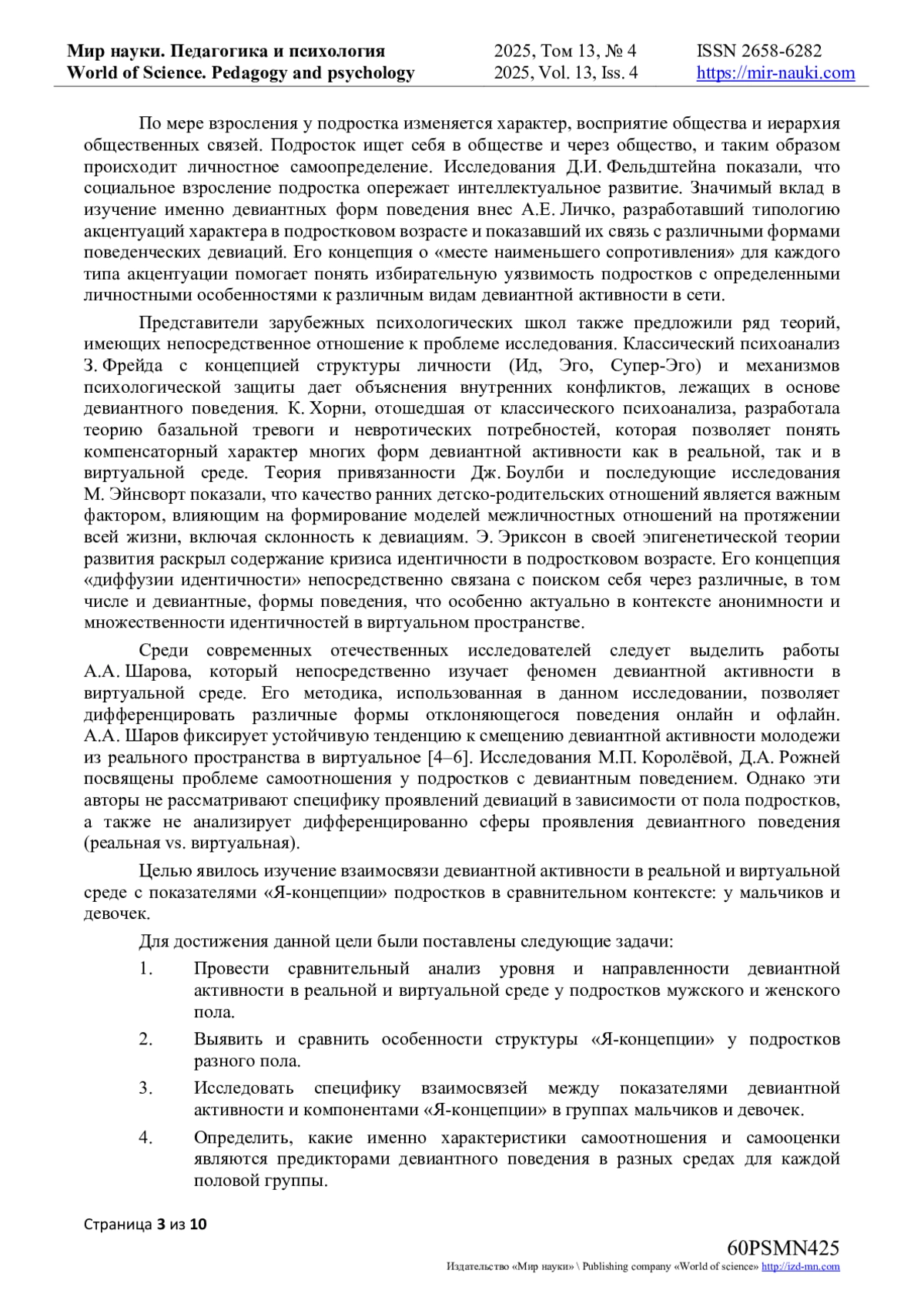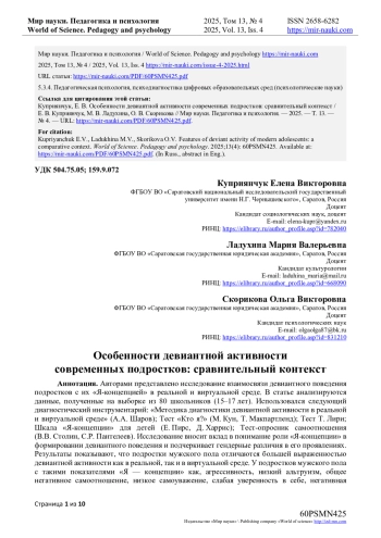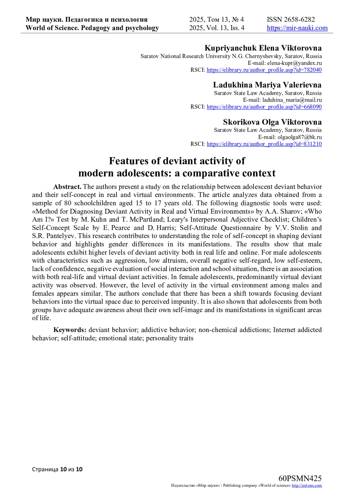 Авторами представлено исследование взаимосвязи девиантного поведения подростков с их «Я-концепцией» в реальной и виртуальной среде. В статье анализируются данные, полученные на выборке из 80 школьников (15-17 лет). Использовался следующий диагностический инструментарий: «Методика диагностики девиантной активности в реальной и виртуальной среде» (А. А. Шаров); Тест «Кто я?» (М. Кун, Т. Макпартленд); Тест Т. Лири; Шкала «Я-концепции» для детей (Е. Пирс, Д. Харрис); Тест-опросник cамоотношения (В. В. Столин, С. Р. Пантелеев). Исследование вносит вклад в понимание роли «Я-концепции» в формировании девиантного поведения и подчеркивает гендерные различия в его проявлениях.