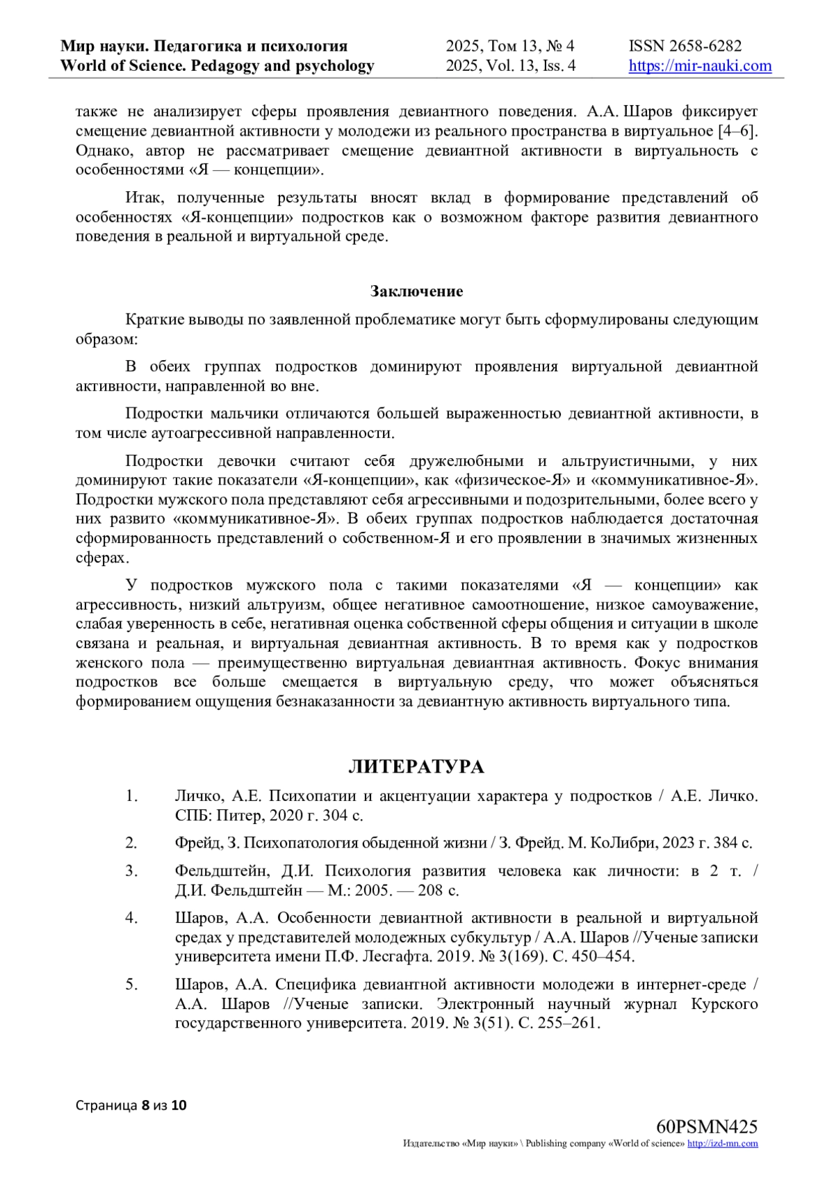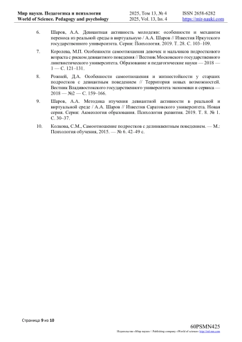 9. Шаров, А.А. Методика изучения девиантной активности в реальной и виртуальной среде / А.А. Шаров // Известия Саратовского университета. Новая серия. Серия: Акмеология образования. Психология развития. 2019. Т. 8. № 1. С. 30-37. EDN: VXNDGI