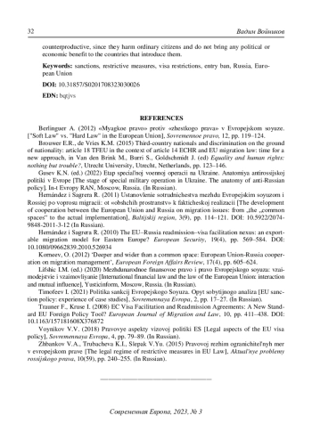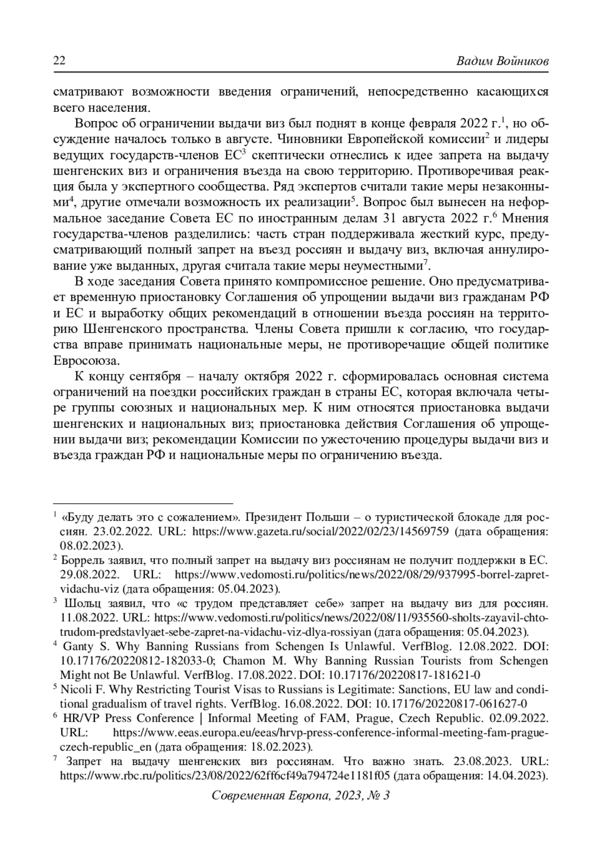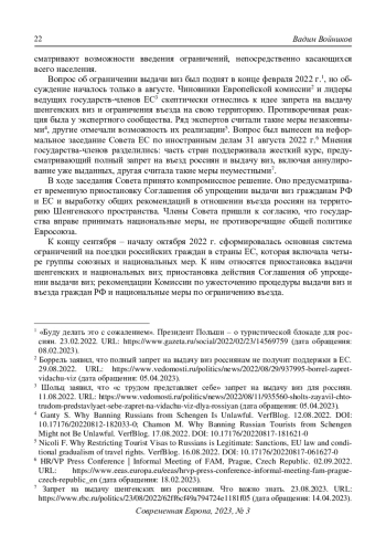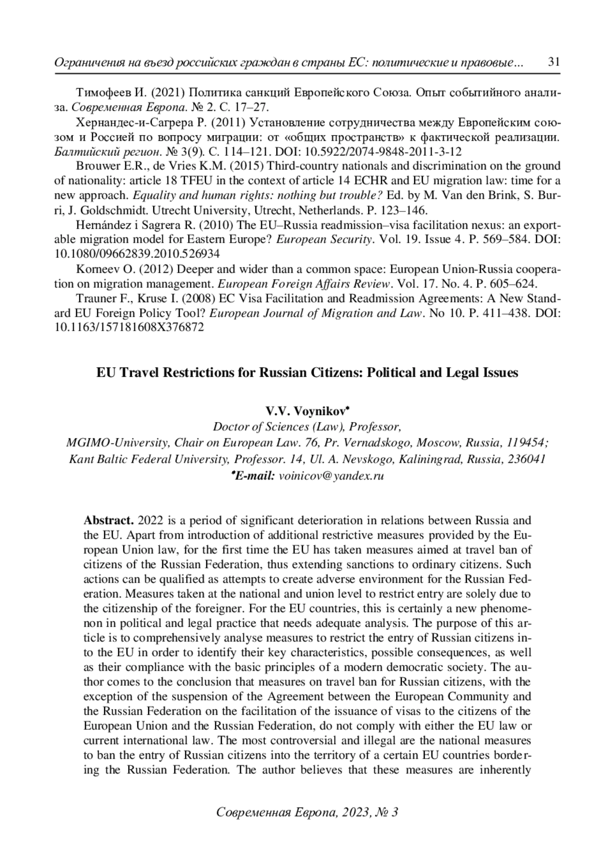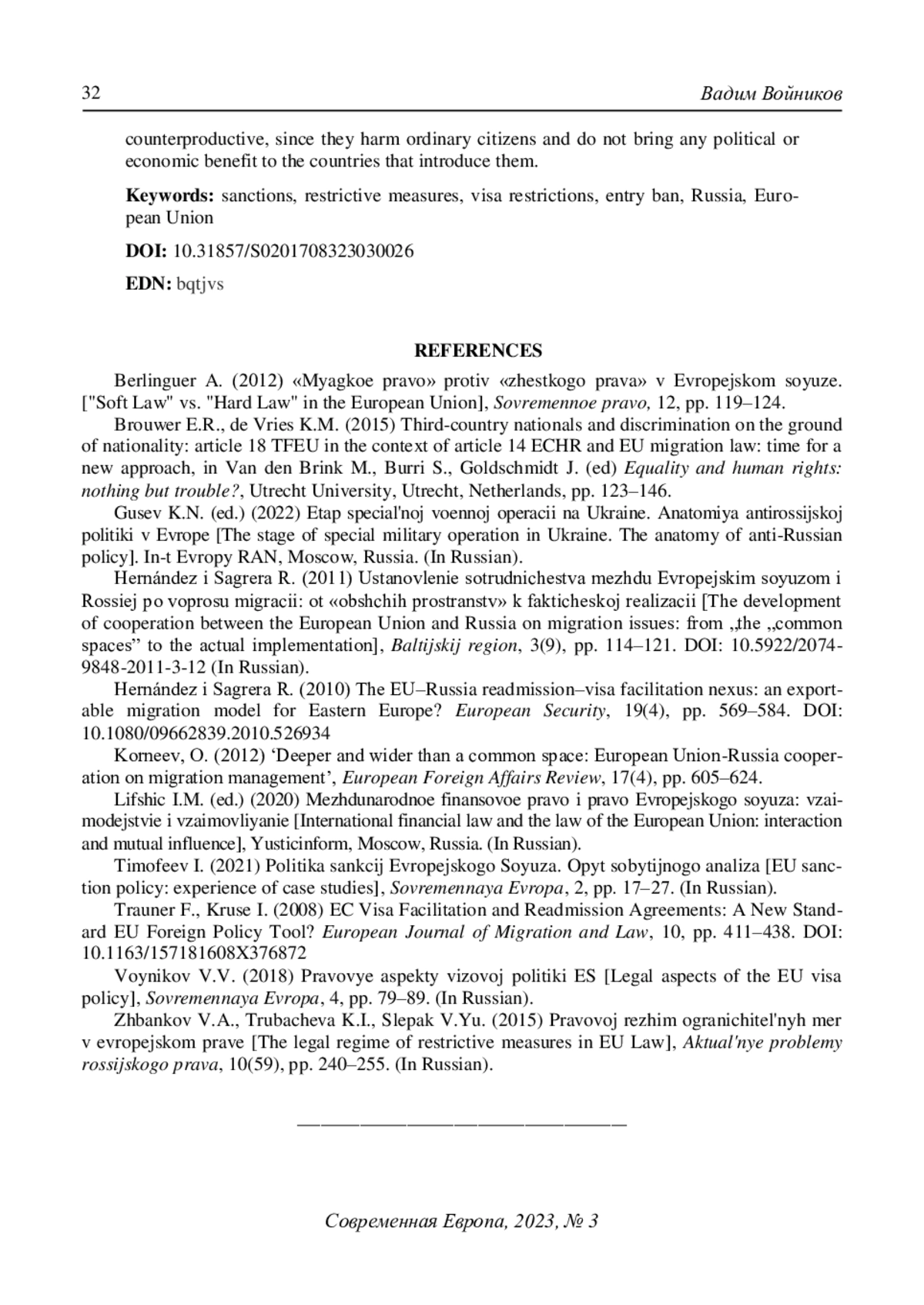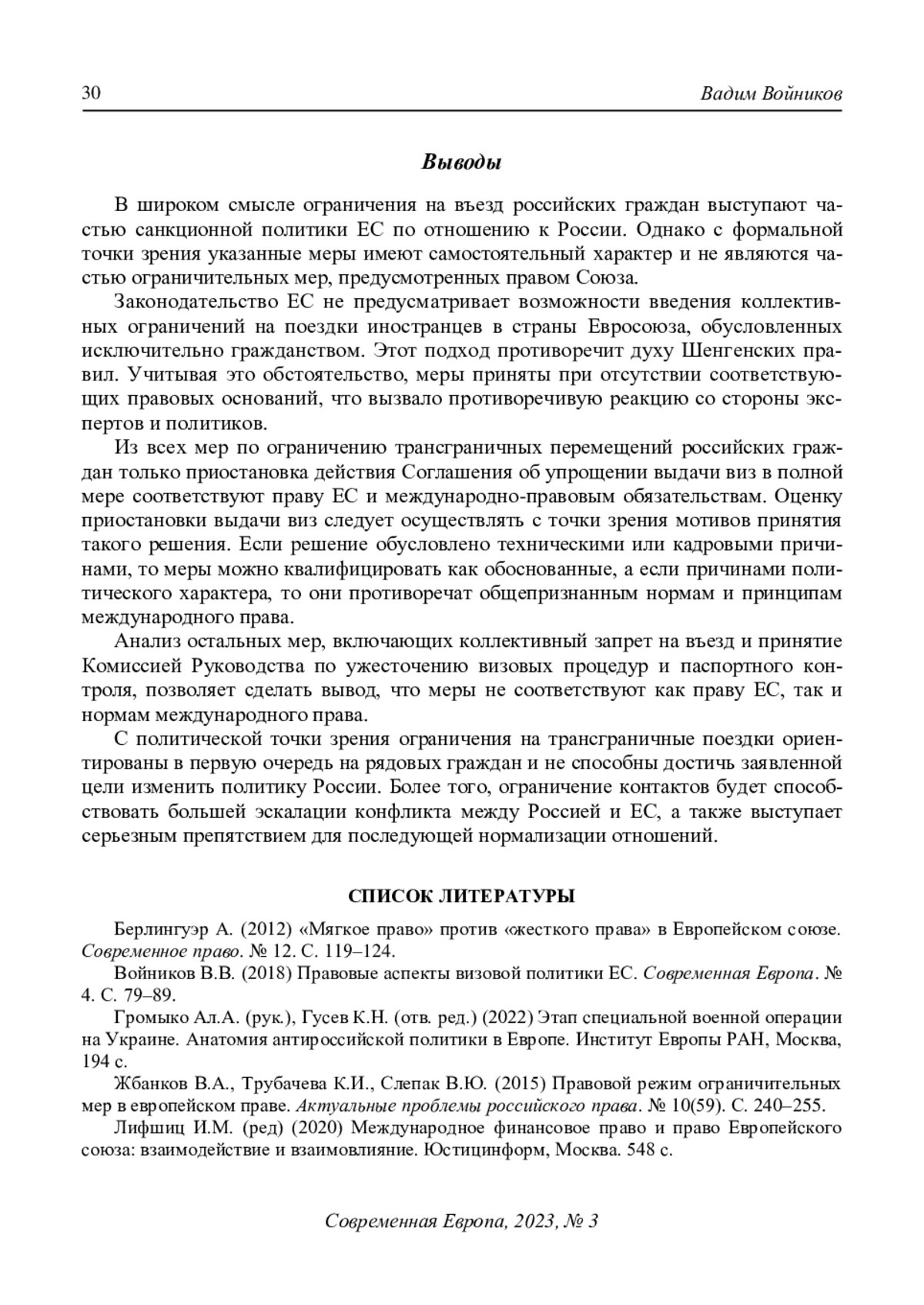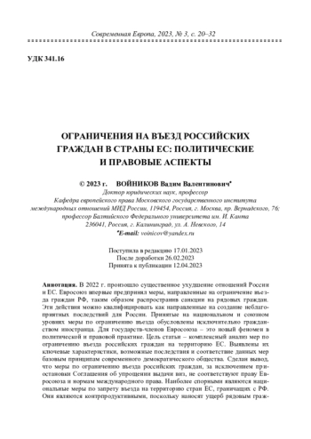 2. Войников В.В. (2018) Правовые аспекты визовой политики ЕС. Современная Европа. № 4. С. 79-89. EDN: YORUPB