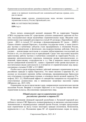 В 2022 г. произошло существенное ухудшение отношений России и ЕС. Евросоюз впервые предпринял меры, направленные на ограничение въезда граждан РФ, таким образом распространив санкции на рядовых граждан. Эти действия можно квалифицировать как направленные на создание неблагоприятных последствий для России. Принятые на национальном и союзном уровнях меры по ограничению въезда обусловлены исключительно гражданством иностранца. Для государств-членов Евросоюза – это новый феномен в политической и правовой практике. Цель статьи – комплексный анализ мер по ограничению въезда российских граждан на территорию ЕС. Выявлены их ключевые характеристики, возможные последствия и соответствие данных мер базовым принципам современного демократического общества. Сделан вывод, что меры по ограничению въезда российских граждан, за исключением приостановки Соглашения об упрощении выдачи виз, не соответствуют праву Евросоюза и нормам международного права. Наиболее спорными являются национальные меры по запрету въезда на территорию стран ЕС, граничащих с РФ. Они являются контрпродуктивными, поскольку наносят ущерб рядовым гражданам и не приносят политической или экономической выгоды странам, которые их вводят