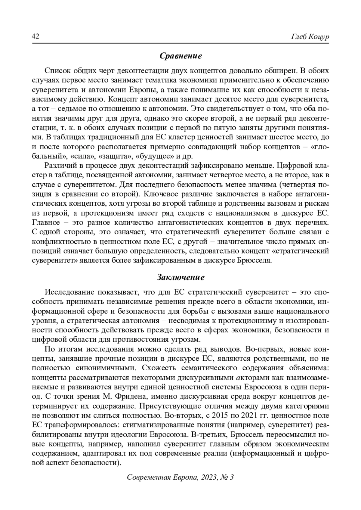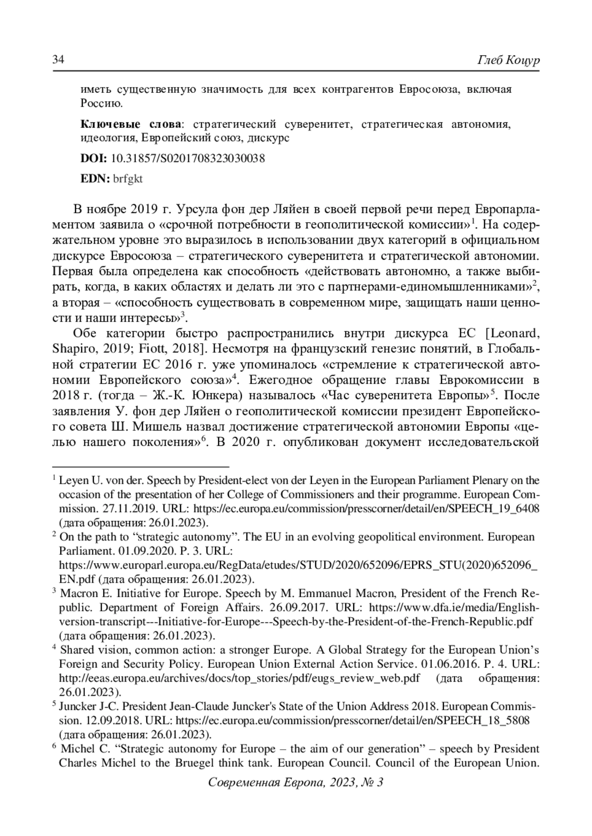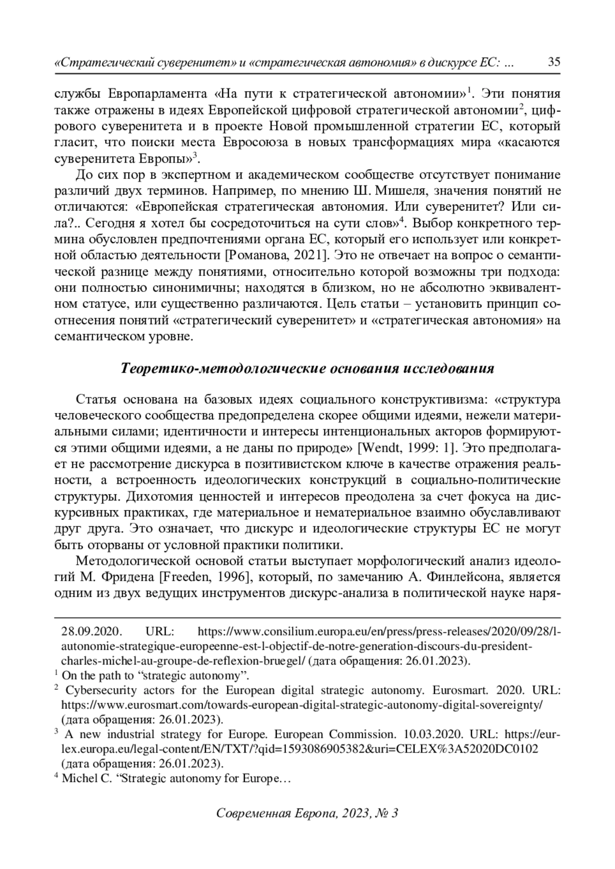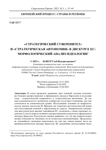 В статье проведено сравнение двух понятий, которые получают все большее распространение в официальном дискурсе Евросоюза в последние годы – «стратегический суверенитет» и «стратегическая автономия». До сих пор в академическом и экспертном сообществе отсутствует понимание, как они соотносятся на семантическом уровне. Исследование основано на морфологическом анализе идеологии М. Фридена как теоретико-методологической рамки для сопоставления понятий и определения их смысла. Эмпирическим материалом выступили речи высших чиновников ЕС, политиков, а также ключевые документы Союза в период активного распространения концептов в официальном дискурсе Брюсселя. В результате анализа выявлено, что эти два понятия можно назвать близкими по значению, но не полностью синонимичными. Предсказать их дальнейшую эволюцию невозможно, но они уже заняли важное место во внешнеполитическом дискурсе Брюсселя. Их дальнейшее использование будет иметь существенную значимость для всех контрагентов Евросоюза, включая Россию