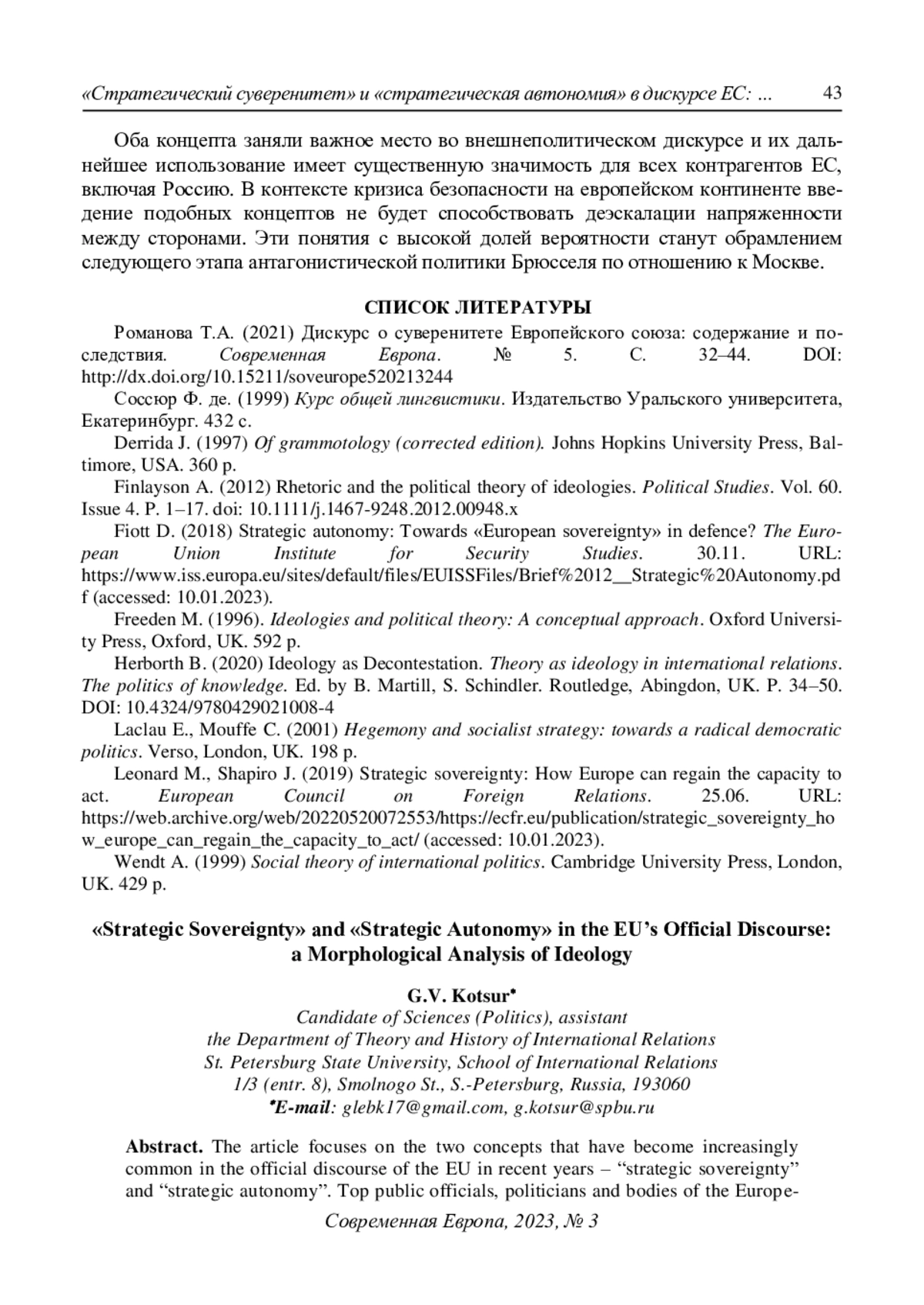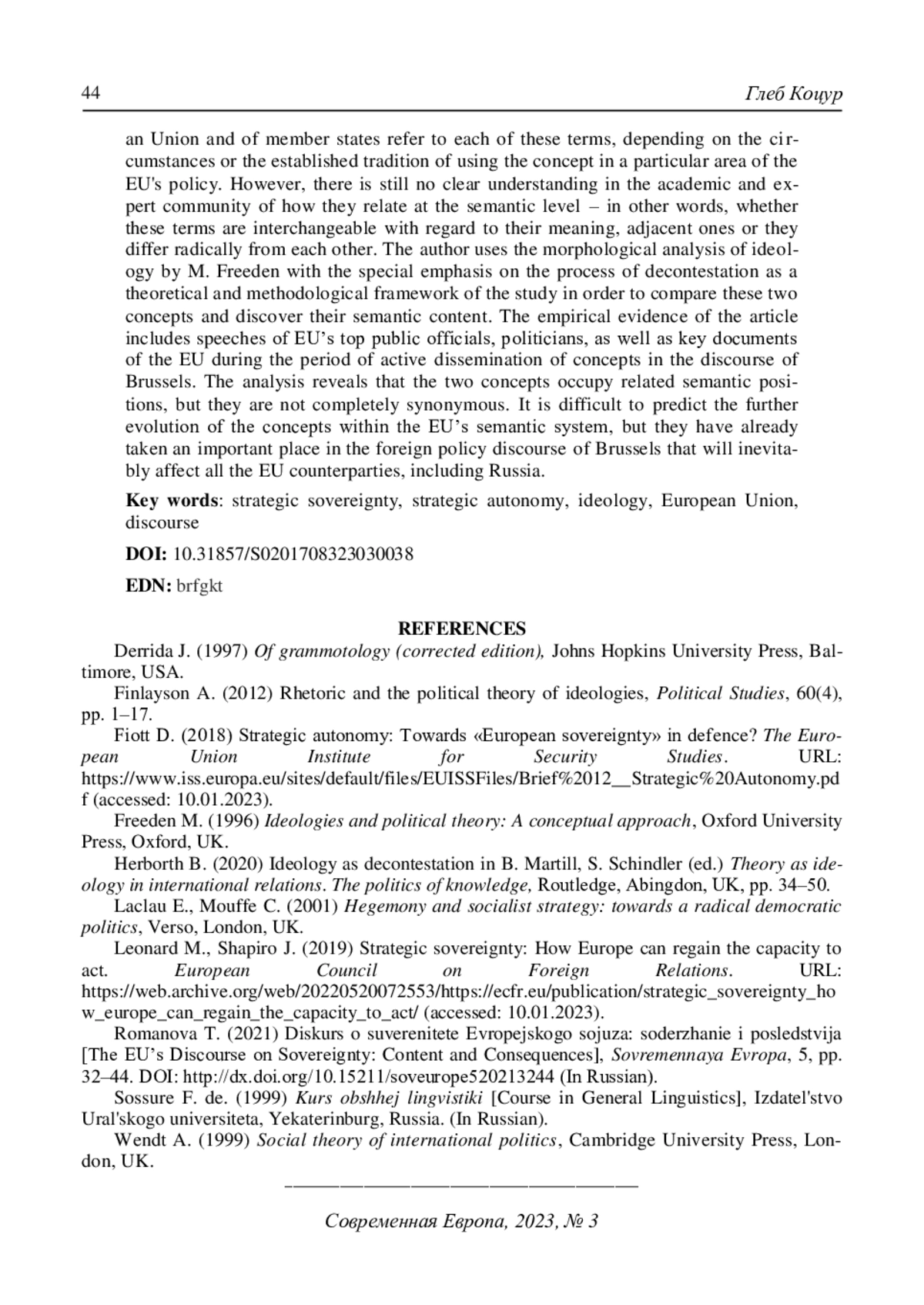 1. Романова Т.А. (2021) Дискурс о суверенитете Европейского союза: содержание и последствия. Современная Европа. № 5. С. 32-44. DOI: 10.15211/soveurope520213244 EDN: VXAWOX
