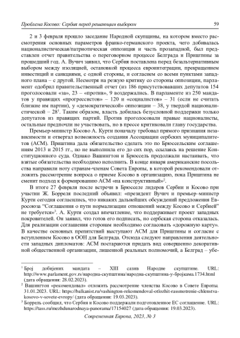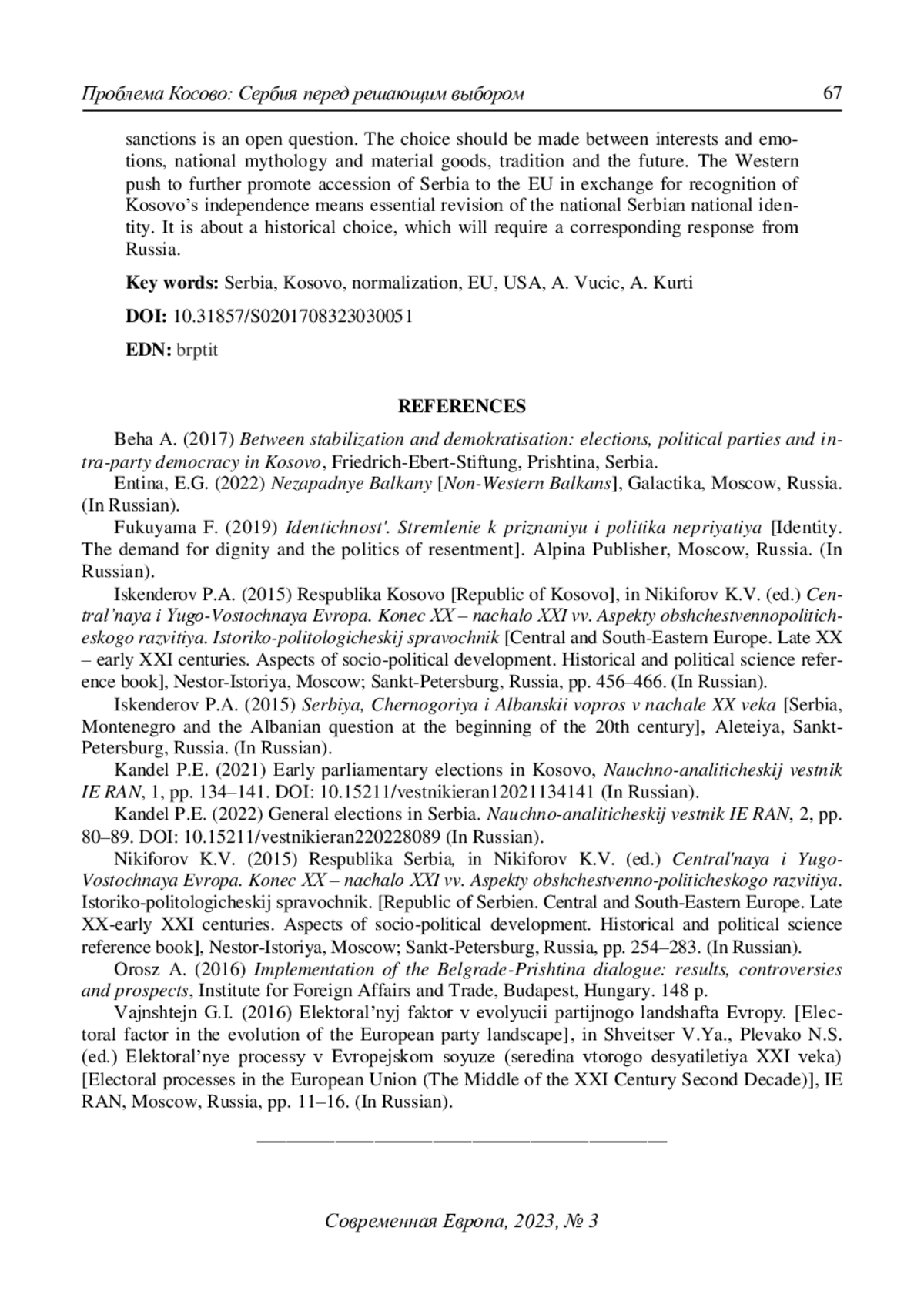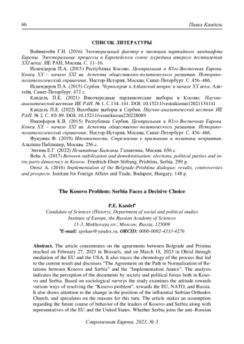 4. Кандель П.Е. (2021) Внеочередные парламентские выборы в Косово. Научно-аналитический вестник ИЕ РАН. № 1. С.134-141. DOI: 10.15211/vestnikieran12021134141 EDN: XINOYI