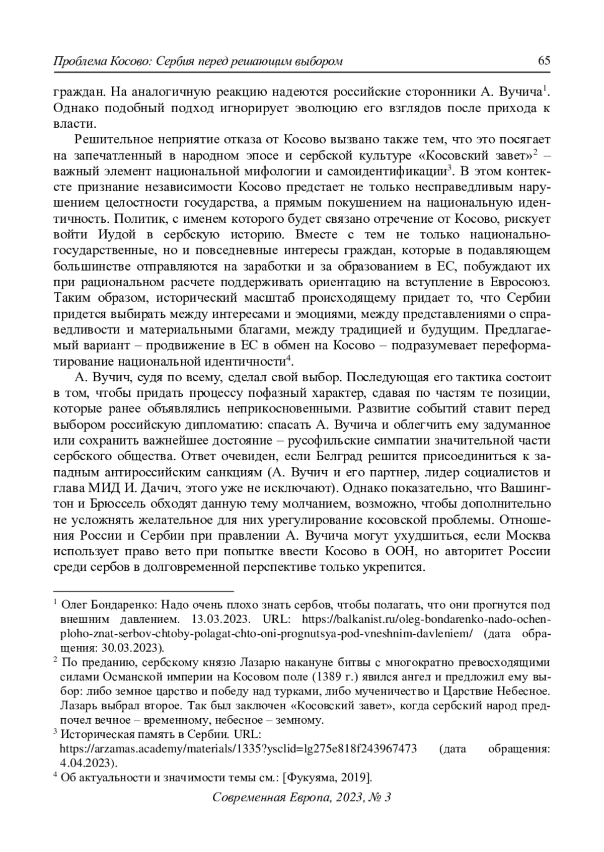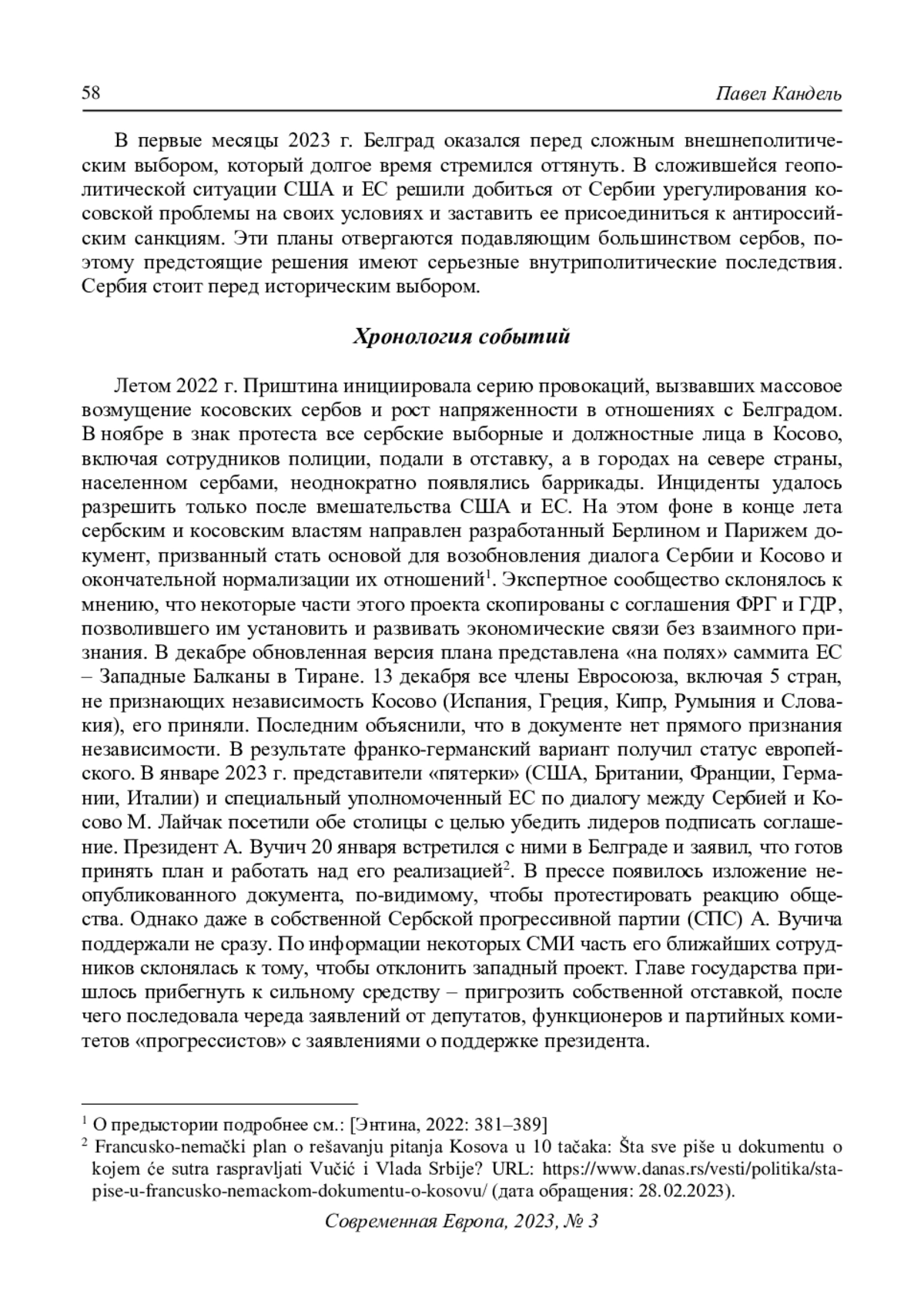В первые месяцы 2023 г. Белград оказался перед сложным внешнеполитическим выбором, который долгое время стремился оттянуть. В сложившейся геополитической ситуации США и ЕС решили добиться от Сербии урегулирования косовской проблемы на своих условиях и заставить ее присоединиться к антироссийским санкциям. Эти планы отвергаются подавляющим большинством сербов, поэтому предстоящие решения имеют серьезные внутриполитические последствия. Сербия стоит перед историческим выбором.
