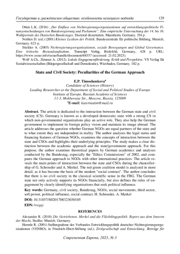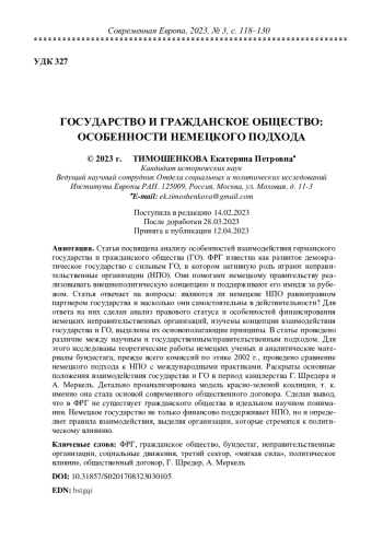 Статья посвящена анализу особенностей взаимодействия германского государства и гражданского общества (ГО). ФРГ известна как развитое демократическое государство с сильным ГО, в котором активную роль играют неправительственные организации (НПО). Они помогают немецкому правительству реализовывать внешнеполитическую концепцию и поддерживают его имидж за рубежом. Статья отвечает на вопросы: являются ли немецкие НПО равноправном партнером государства и насколько они самостоятельны в действительности? Для ответа на них сделан анализ правового статуса и особенностей финансирования немецких неправительственных организаций, изучены концепции взаимодействия государства и ГО, выделены их основополагающие принципы. В статье проведено различие между научным и государственным/правительственным подходом. Для этого исследованы теоретические работы немецких ученых и аналитические материалы бундестага, прежде всего комиссий по этике 2002 г., проведено сравнение немецкого подхода к НПО с международными практиками. Раскрыты основные положения взаимодействия государства и ГО в период канцлерства Г. Шредера и А. Меркель. Детально проанализирована модель красно-зеленой коалиции, т. к. именно она стала основой современного общественного договора. Сделан вывод, что в ФРГ не существует гражданского общества в идеальном научном понимании. Немецкое государство не только финансово поддерживает НПО, но и определяет правила взаимодействия, выделяя организации, которые стремятся к политическому влиянию