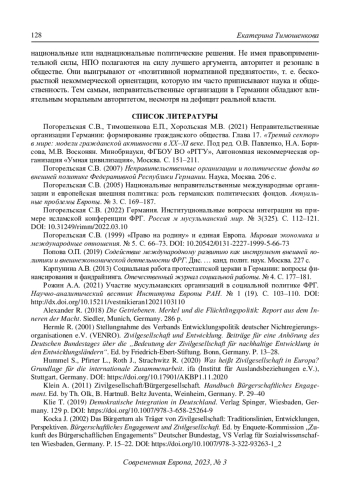 1. Погорельская С.В., Тимошенкова Е.П., Хорольская М.В. (2021) Неправительственные организации Германии: формирование гражданского общества. Глава 17. “Третий сектор” в мире: модели гражданской активности в ХХ-ХI веке. Под ред. О.В. Павленко, Н.А. Борисова, М.В. Восконян. Минобрнауки, ФГБОУ ВО “РГГУ”, Автономная некоммерческая организация “Умная цивилизация”, Москва. С. 151-211.