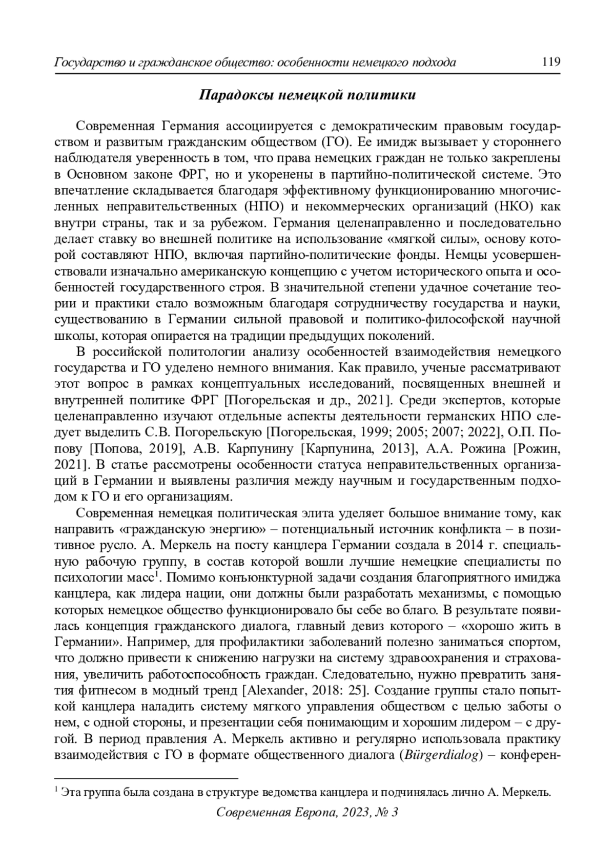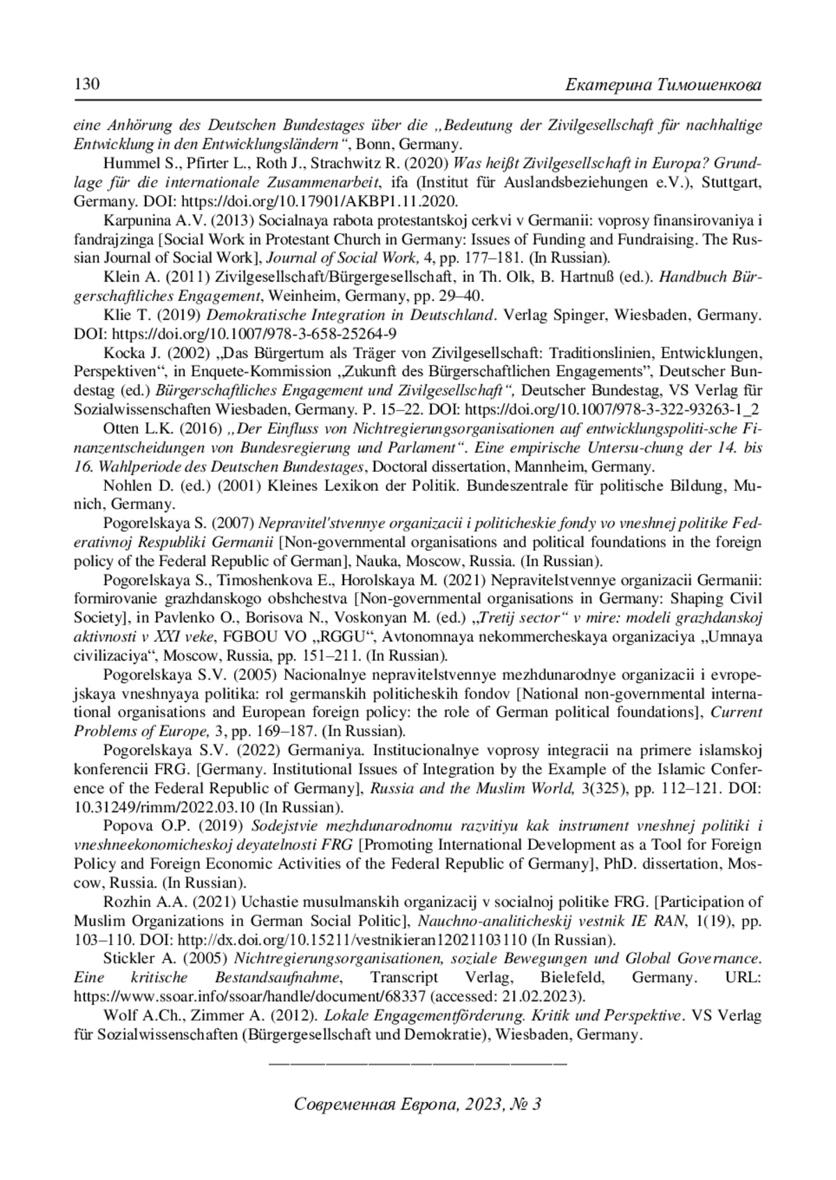 3. Погорельская С.В. (2005) Национальные неправительственные международные организации и европейская внешняя политика: роль германских политических фондов. Актуальные проблемы Европы. № 3. С. 169-187. EDN: HQUTSJ