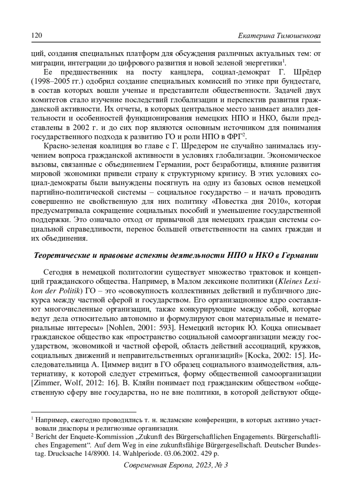 Современная Германия ассоциируется с демократическим правовым государством и развитым гражданским обществом (ГО). Ее имидж вызывает у стороннего наблюдателя уверенность в том, что права немецких граждан не только закреплены в Основном законе ФРГ, но и укоренены в партийно-политической системе. Это впечатление складывается благодаря эффективному функционированию многочисленных неправительственных (НПО) и некоммерческих организаций (НКО) как внутри страны, так и за рубежом. Германия целенаправленно и последовательно делает ставку во внешней политике на использование «мягкой силы», основу которой составляют НПО, включая партийно-политические фонды. Немцы усовершенствовали изначально американскую концепцию с учетом исторического опыта и особенностей государственного строя. В значительной степени удачное сочетание теории и практики стало возможным благодаря сотрудничеству государства и науки, существованию в Германии сильной правовой и политико-философской научной школы, которая опирается на традиции предыдущих поколений