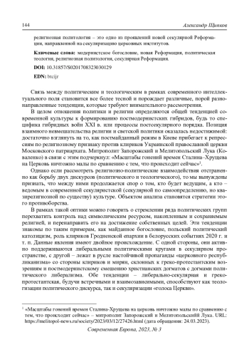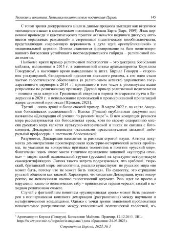 Связь между политическим и теологическим в рамках современного интеллектуального поля становится все более тесной и порождает различные, порой разнонаправленные тенденции, которые требуют внимательного рассмотрения. В целом отношения политики и религии определяются общей тенденцией современной культуры к формированию постмодернистских гибридов, будь то специфика гибридных войн XXI в. или процессы постсекулярного порядка. Позиция взаимного невмешательства религии и светской политики оказалась недостижимой: достаточно взглянуть на то, как постмайданный режим в Киеве прибегает к репрессиям по религиозному признаку против клириков Украинской православной церкви Московского патриархата. Митрополит Запорожский и Мелитопольский Лука (Коваленко) в связи с этим подчеркнул: «Масштабы гонений времен Сталина‒Хрущева на Церковь ничтожно малы по сравнению с тем, что происходит сейчас»
