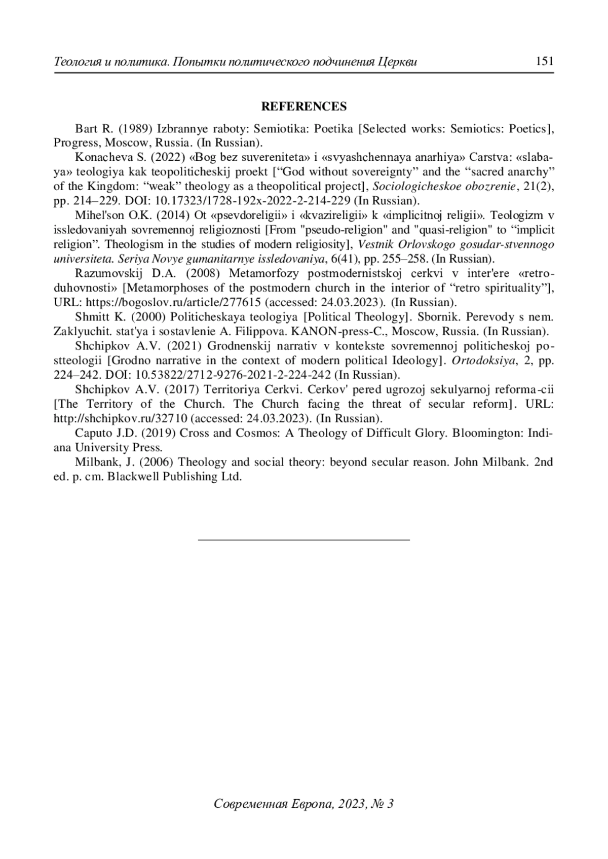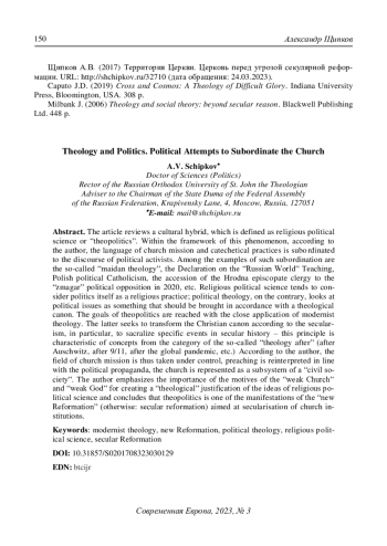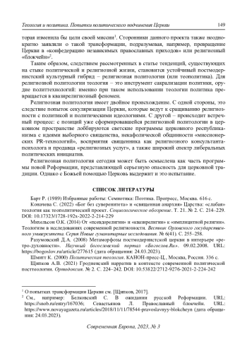 2. Коначева С. (2022) “Бог без суверенитета” и “священная анархия” Царства: “слабая” теология как теополитический проект. Социологическое обозрение. Т. 21. № 2. С. 214-229. DOI: 10.17323/1728-192x-2022-2-214-229 EDN: WHAUDT