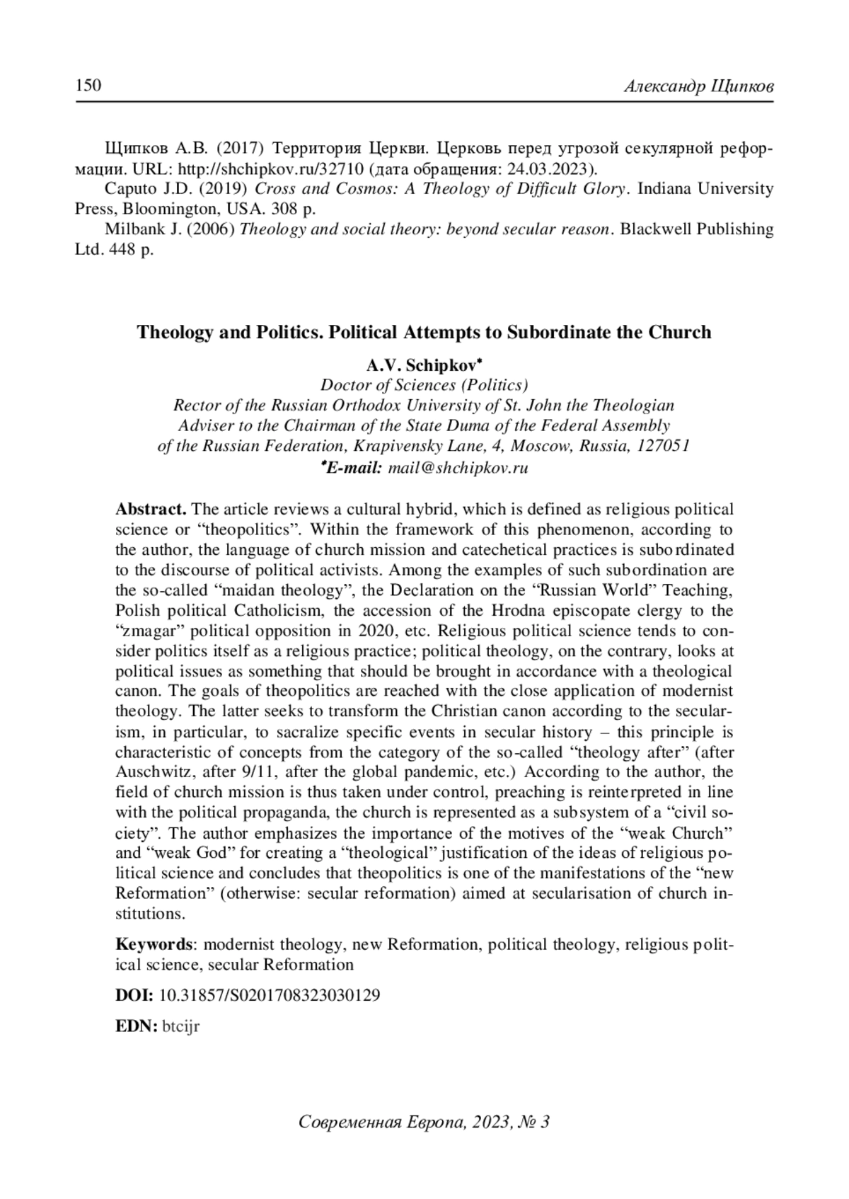 7. Щипков А.В. (2017) Территория Церкви. Церковь перед угрозой секулярной реформации. URL: http://shchipkov.ru/32710.