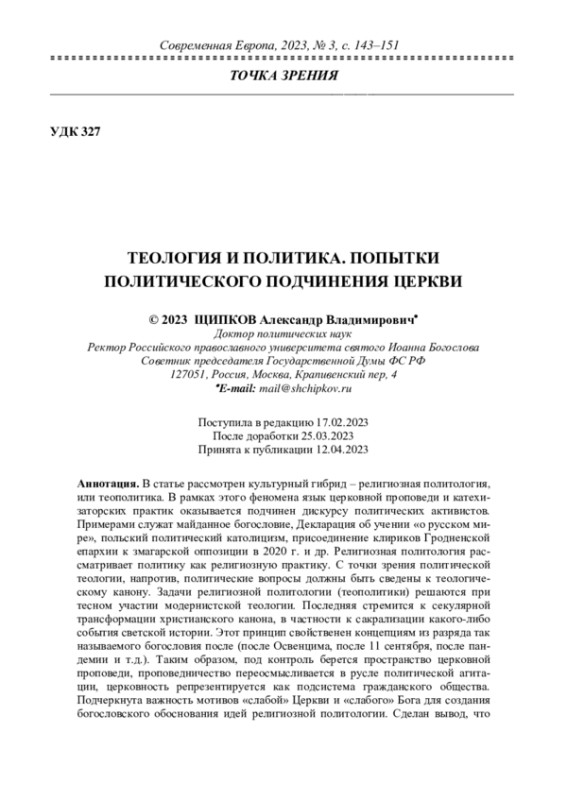 В статье рассмотрен культурный гибрид – религиозная политология, или теополитика. В рамках этого феномена язык церковной проповеди и катехизаторских практик оказывается подчинен дискурсу политических активистов. Примерами служат майданное богословие, Декларация об учении «о русском мире», польский политический католицизм, присоединение клириков Гродненской епархии к змагарской оппозиции в 2020 г. и др. Религиозная политология рассматривает политику как религиозную практику. С точки зрения политической теологии, напротив, политические вопросы должны быть сведены к теологическому канону. Задачи религиозной политологии (теополитики) решаются при тесном участии модернистской теологии. Последняя стремится к секулярной трансформации христианского канона, в частности к сакрализации какого-либо события светской истории. Этот принцип свойственен концепциям из разряда так называемого богословия после (после Освенцима, после 11 сентября, после пандемии и т. д.). Таким образом, под контроль берется пространство церковной проповеди, проповедничество переосмысливается в русле политической агитации, церковность репрезентируется как подсистема гражданского общества. Подчеркнута важность мотивов «слабой» Церкви и «слабого» Бога для создания богословского обоснования идей религиозной политологии. Сделан вывод, что Современная Европа, религиозная политология – это одно из проявлений новой секулярной Реформации, направленной на секуляризацию церковных институтов