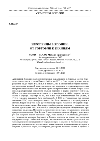 Торговые фактории голландцев существовали в Хирадо, а затем в Дэсиме на севере-западе острова Кюсю с 1609 г. по 1855 г. Этот период условно можно разделить на две части. В XVII в. и в начале XVIII в. отношения японцев и голландцев отличались взаимной заинтересованностью в торговле и готовностью последних беспрекословно подчиняться жестким правилам пребывания в Японии. Вторая половина характеризуется снижением объемов торговли и ростом взаимного интереса. Объем торговли начал снижаться после того, как сѐгунат в 1668 г. запретил экспорт золота и серебра. Несмотря на то, что вывоз меди компенсировал эти убытки, в 1743 г. торговля перестала быть прибыльной. В 1799 г. Голландская Ост-индская компания (VOC) перестала существовать. Это было связано как с потерей рынков в Персии, Индии и Европе, так и с ростом конкуренции с Англией и Францией в борьбе за колониальные рынки. Другая причина банкротства компании – управленческие ошибки руководства: VOC выплачивала дивиденды акционерам в Нидерландах, превышающие ее доходы. Несмотря на экономические потери, обе стороны не спешили прекращать отношения. Для Японии Дэсима оставалась окном в Европу, через которое они получали знания о внешнем мире, о его научных и технических достижениях. Нидерланды, сохраняя факторию в Японии, исходили не только из стремления поддержать статус глобальной империи, но и возможности изучить уникальный интеллектуальный и культурный потенциал японцев. Появление в Японии квалифицированных переводчиков с голландского языка совпало с возникновением интереса у сѐгуната к развитию науки, что открыло для страны источник знаний и привело к возникновению новой отрасли науки – рангаку, которая в переводе означает голландская наука
