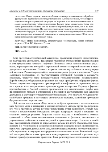 В кардинально изменившемся мире геополитические издержки и ошибки в результате недооцененности или, наоборот, переоцененности все более нелинейно-гибридных процессов, противоречивых тенденций и спонтанных зачастую событий приобретают повышенную практико-политическую значимость. В этих условиях в центре исследовательского внимания не мог не оказаться только что опубликованный труд французских ученых и экспертовмеждународников под ярким и многозначащим названием «Мир никогда не будет прежним». В фокусе анализа – обостренно актуализированный контекст современной кризисной геополитики. Концептуально-аналитическую основу текста образуют обширные вводные и одновременно обобщающие разделы, систематизирующие два десятка глав на самые различные международные темы и проблемы. Они написаны соруководителями авторского коллектива, известными французскими политологами-международниками Бертраном Бади и Домиником Видалем. Во главе угла – новый подход, который предопределен не заранее, а создан на основе жизненной практики в результате и под воздействием исторических неожиданностей, непредвиденных и даже невообразимых ранее событий. Предпринята попытка рассмотреть проблематику будущего мирового порядка через призму великодержавных противоречий, противостояния различных ценностных ориентаций и моделей развития с форсированным акцентом на борьбу демократий и автократий. На примере США переосмыслено понятие мирового господства. Книга отражает новые особенности экспертно-аналитической работы французских исследователей-международников. Авторы осознают, что конфронтационная острота кризисной ситуации на Украине и ее интернационализация в самых разнообразных гибридизированных формах резко «раскачали» более или менее устоявшийся баланс сил не только в европейском регионе, но и во всем глобальном пространстве. На карту поставлены оптимистические варианты нового мирового порядка. В отдельных разделах книги хаотизация мировой политики и международных отношений увязывается с «гипердержавностью» США, которая приближается к критической точке.