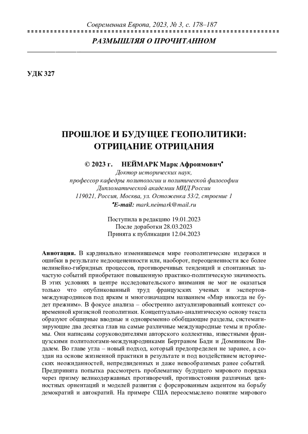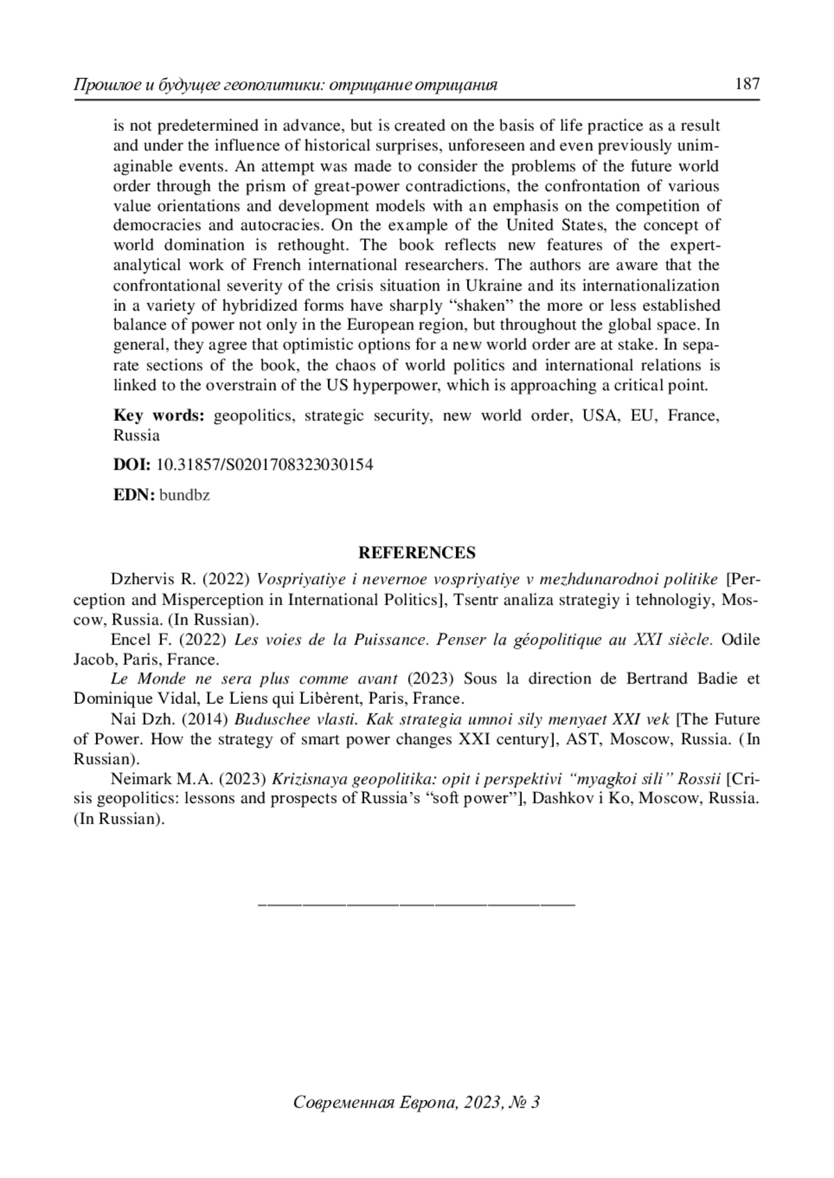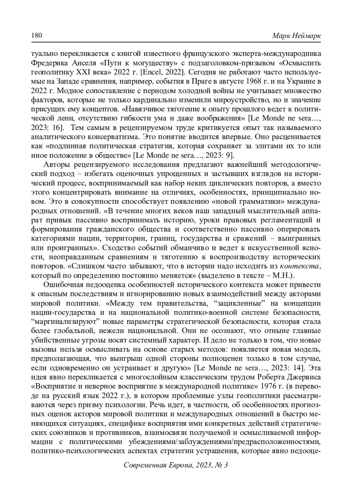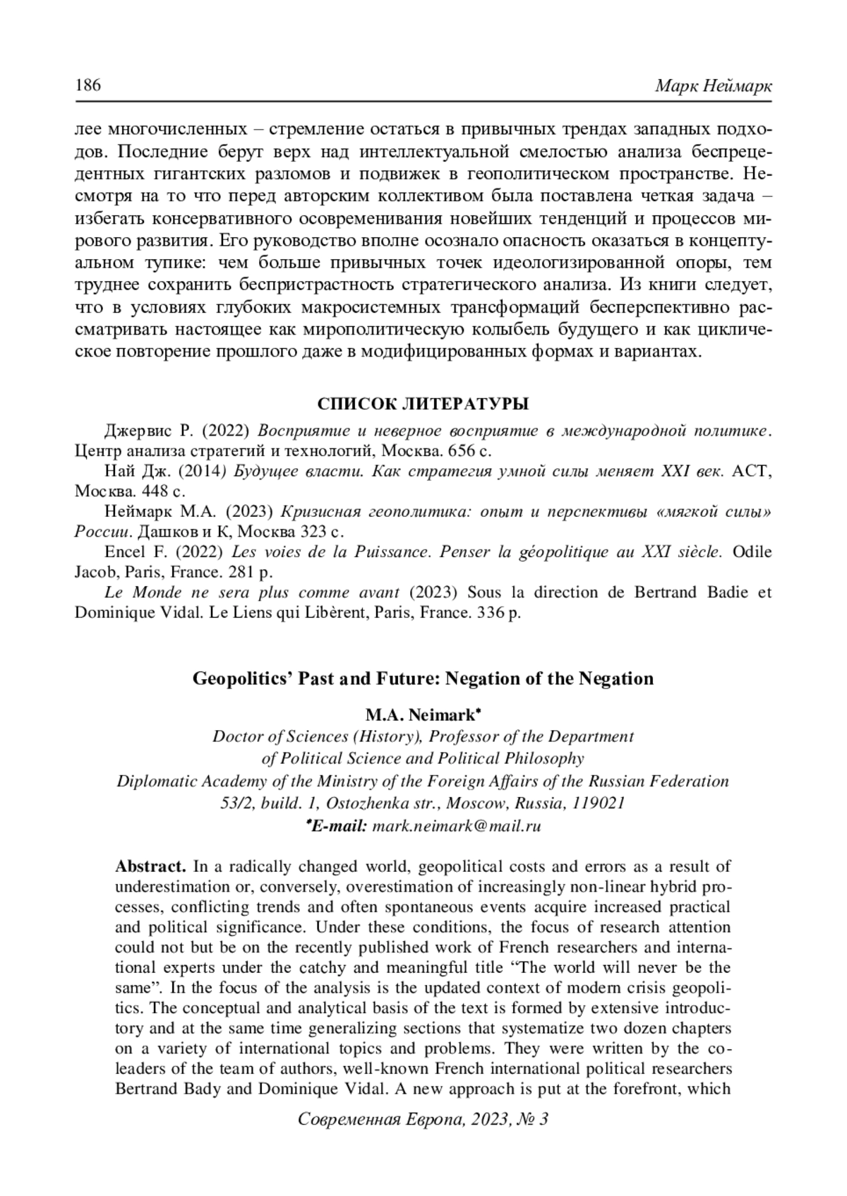3. Неймарк М.А. (2023) Кризисная геополитика: опыт и перспективы “мягкой силы” России. Дашков и К, Москва 323 с. EDN: BPEOEC