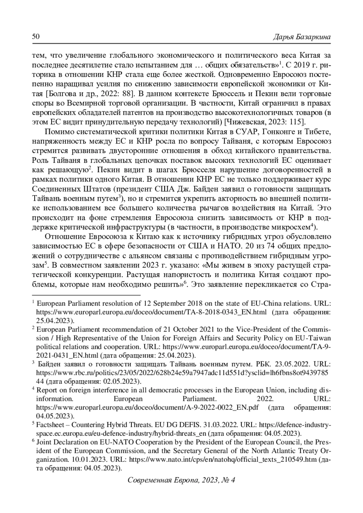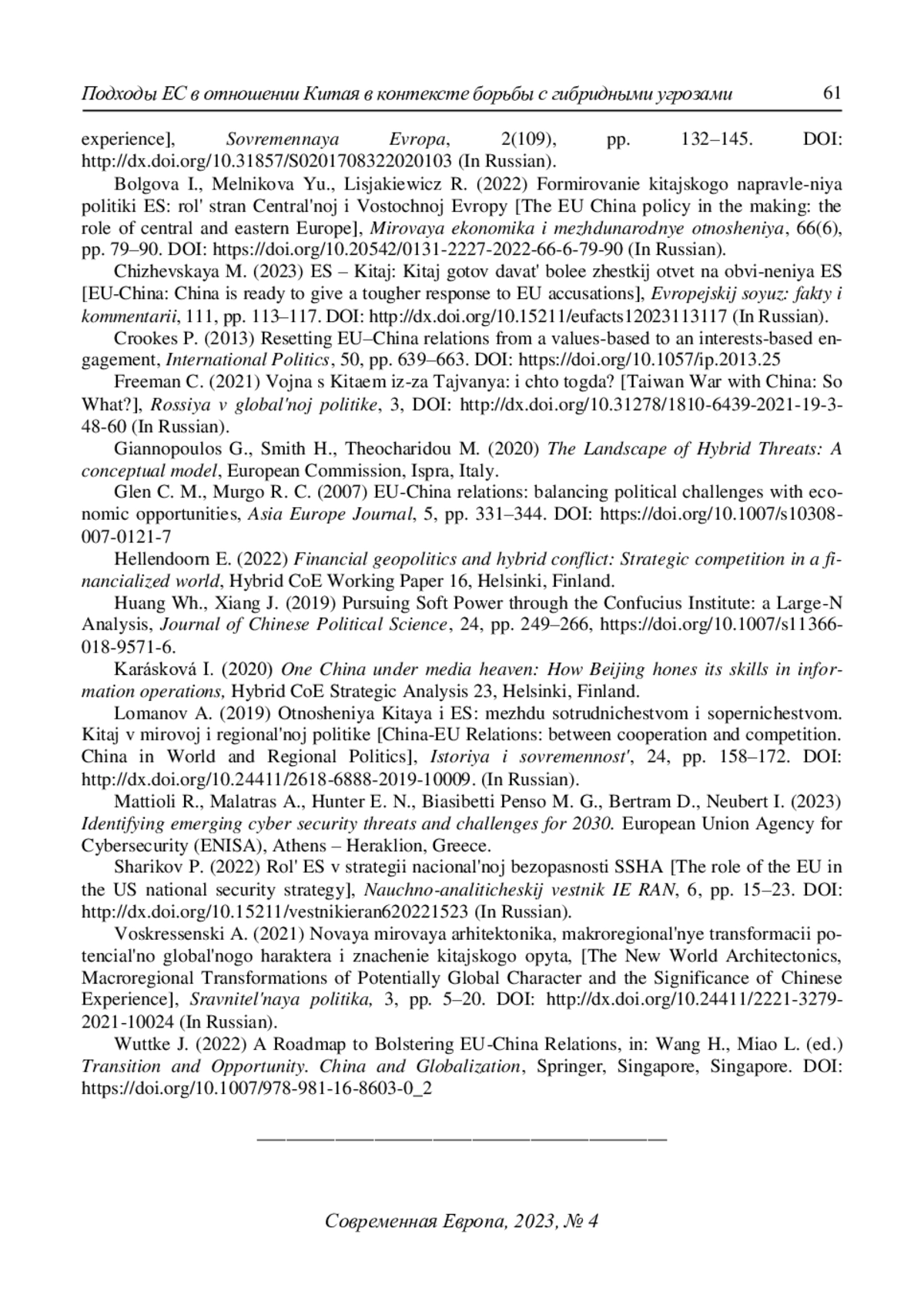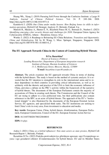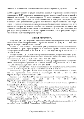 1. Базаркина Д.Ю. (2022) Практика противодействия гибридным угрозам: опыт Европейского союза и его государств-членов. Современная Европа. № 2(109). С. 132-145. DOI: 10.31857/S0201708322020103 EDN: NBQEZR