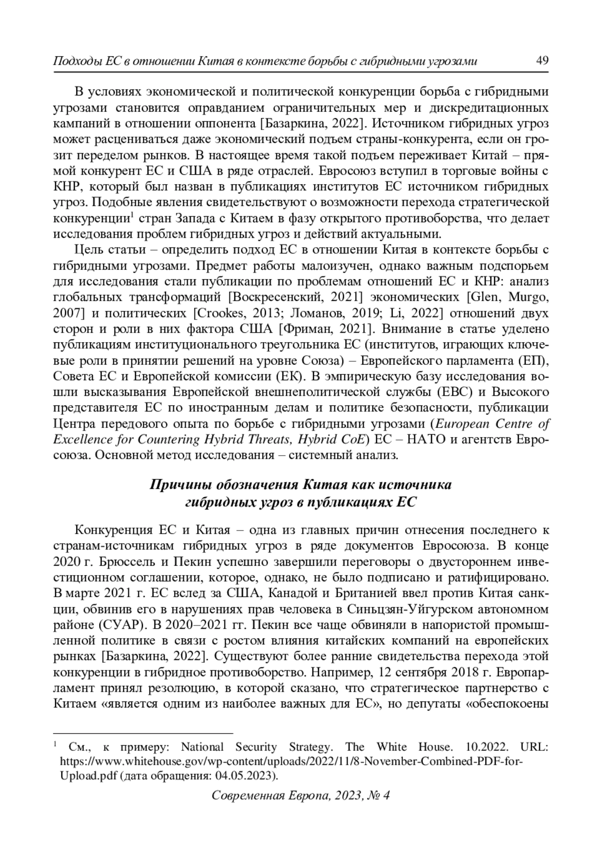 В условиях экономической и политической конкуренции борьба с гибридными угрозами становится оправданием ограничительных мер и дискредитационных кампаний в отношении оппонента [Базаркина, 2022]. Источником гибридных угроз может расцениваться даже экономический подъем страны-конкурента, если он грозит переделом рынков. В настоящее время такой подъем переживает Китай – прямой конкурент ЕС и США в ряде отраслей. Евросоюз вступил в торговые войны с КНР, который был назван в публикациях институтов ЕС источником гибридных угроз. Подобные явления свидетельствуют о возможности перехода стратегической конкуренции1 стран Запада с Китаем в фазу открытого противоборства, что делает исследования проблем гибридных угроз и действий актуальными