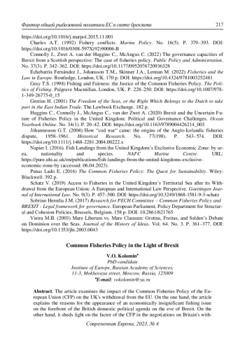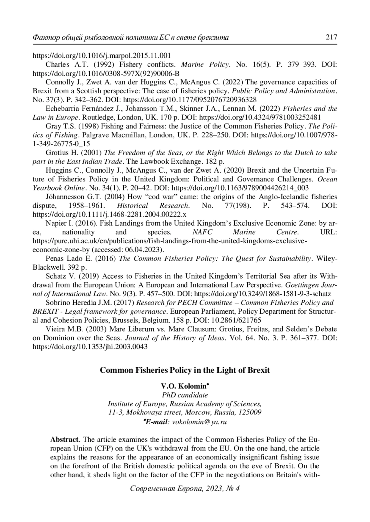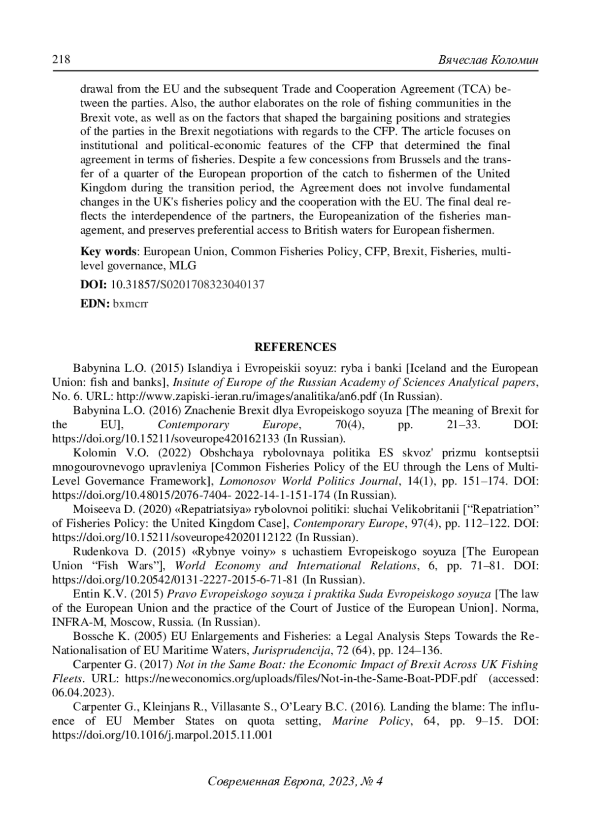 3. Коломин В.О. (2022) Общая рыболовная политика ЕС сквозь призму концепции многоуровневого управления. Вестник Московского Университета. Серия 25: Международные Отношения и Мировая Политика. № 14(1). С. 151-174. DOI: 10.48015/2076-7404-2022-14-1-151-174 EDN: PORNOG