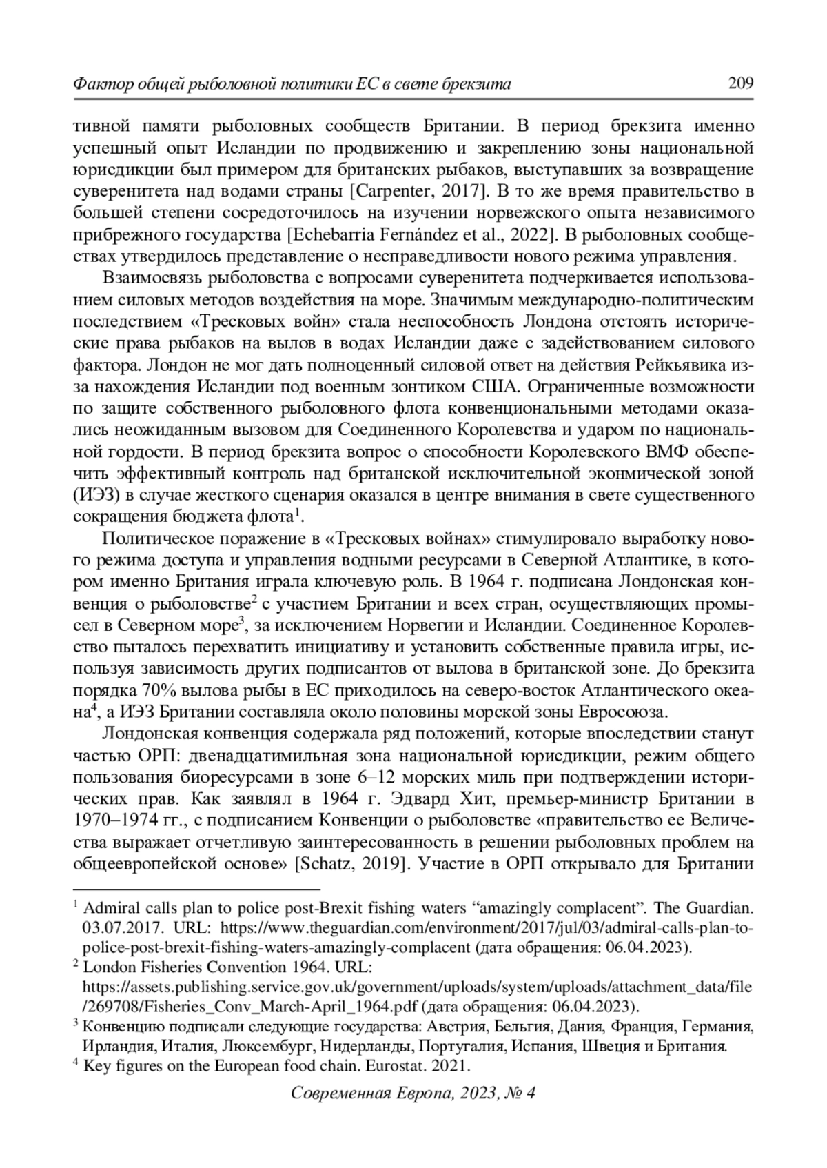 4. Моисеева Д.Э. (2020) “Репатриация” рыболовной политики: случай Великобритании. Современная Европа. № 97(4). С. 112-122. DOI: 10.15211/soveurope42020112122 EDN: PPFLSN